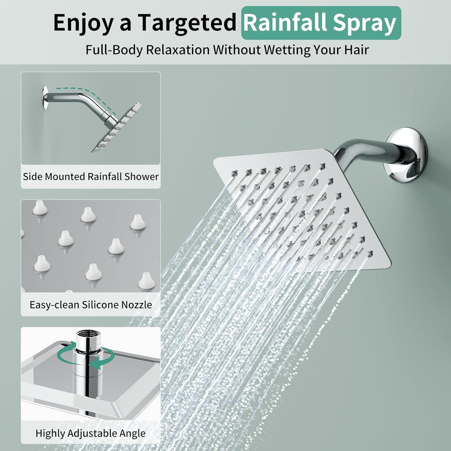 Simultaneous Dual – Mode Function: Run two outlets together: activate 12'' rain shower with 6'' shower head, use the 6'' head paired with the handheld spray, or combine the rain shower and handheld. Each fixed head also operates individually. Ideal for couples, this shower faucet set adds flexibility and enjoyment to shared showers. The handheld spray doubles as a practical cleaner for pets, floors, and bathrooms.