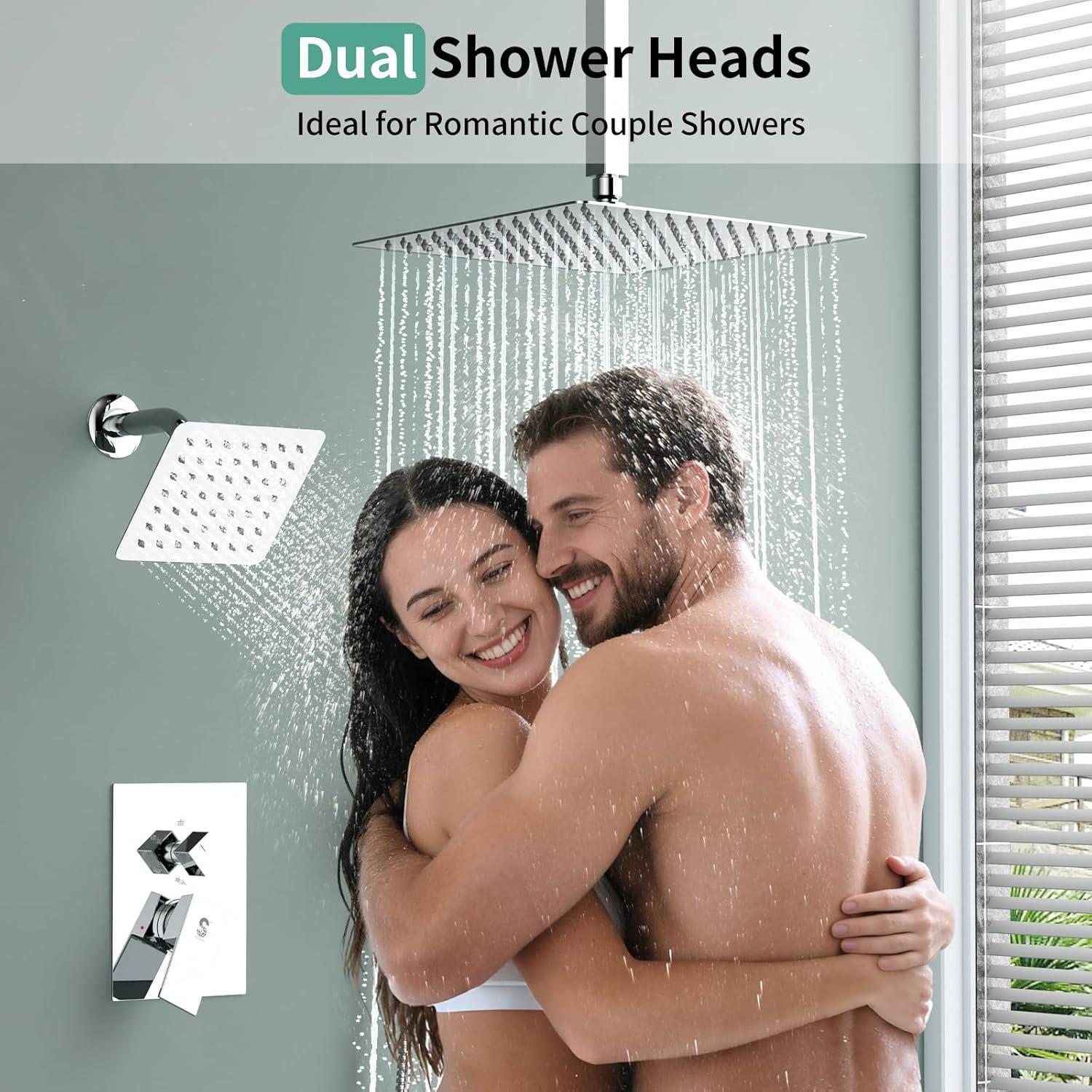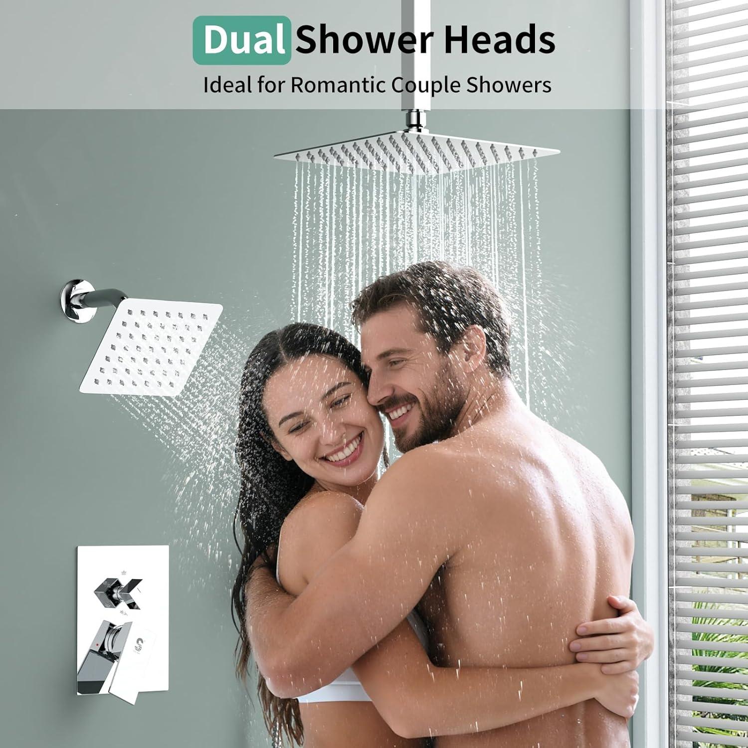 Dual Shower Designed for Couples: Enjoy comfortable side-by-side showering with your partner using two dedicated shower heads: the wide 12-inch rain shower and the focused 6-inch wall-mounted spray. Both can run together, or you can choose to pair either one with the water-saving handheld spray. This flexible setup ensures each person receives full, consistent coverage—no waiting, no cold spots—creating a truly relaxing and shared bathing experience.