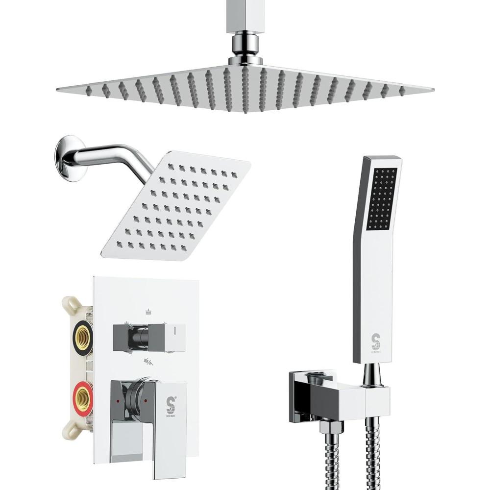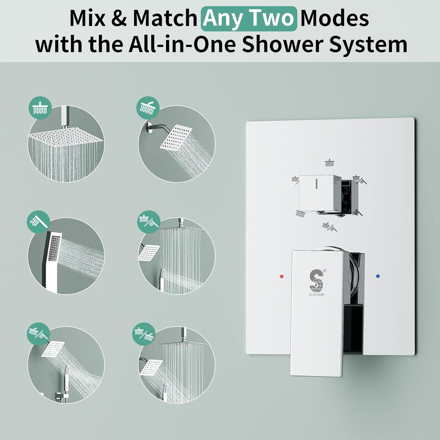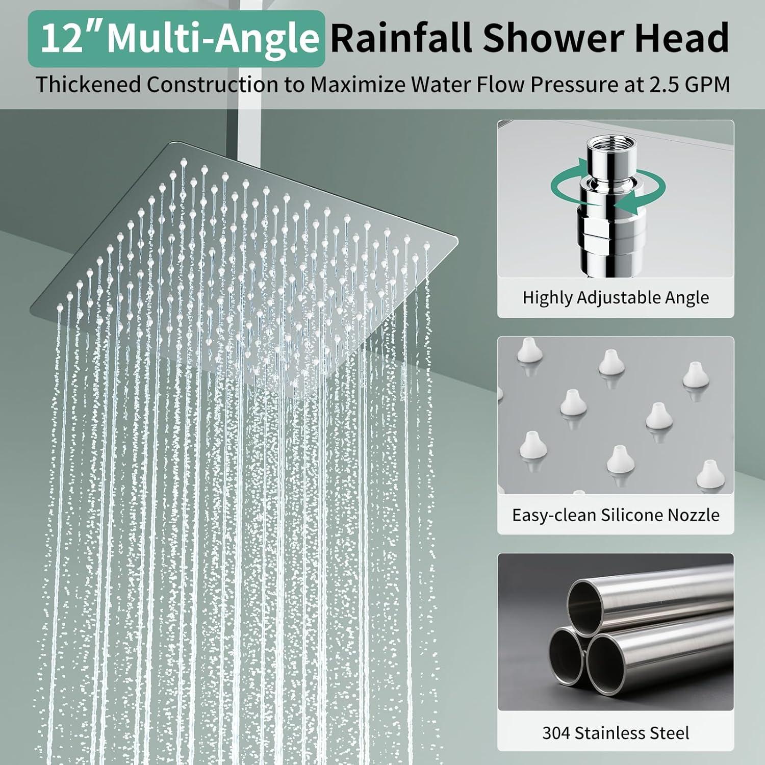 Dual Shower Head System: Includes a 12'' ceiling-mounted rainfall shower head, a 6'' wall-mounted shower head, a handheld spray with 71'' hose, and a pressure-balancing valve. Engineered with higher brass content for superior durability and corrosion resistance, this shower system provides 6 versatile spray modes to customize your shower experience.