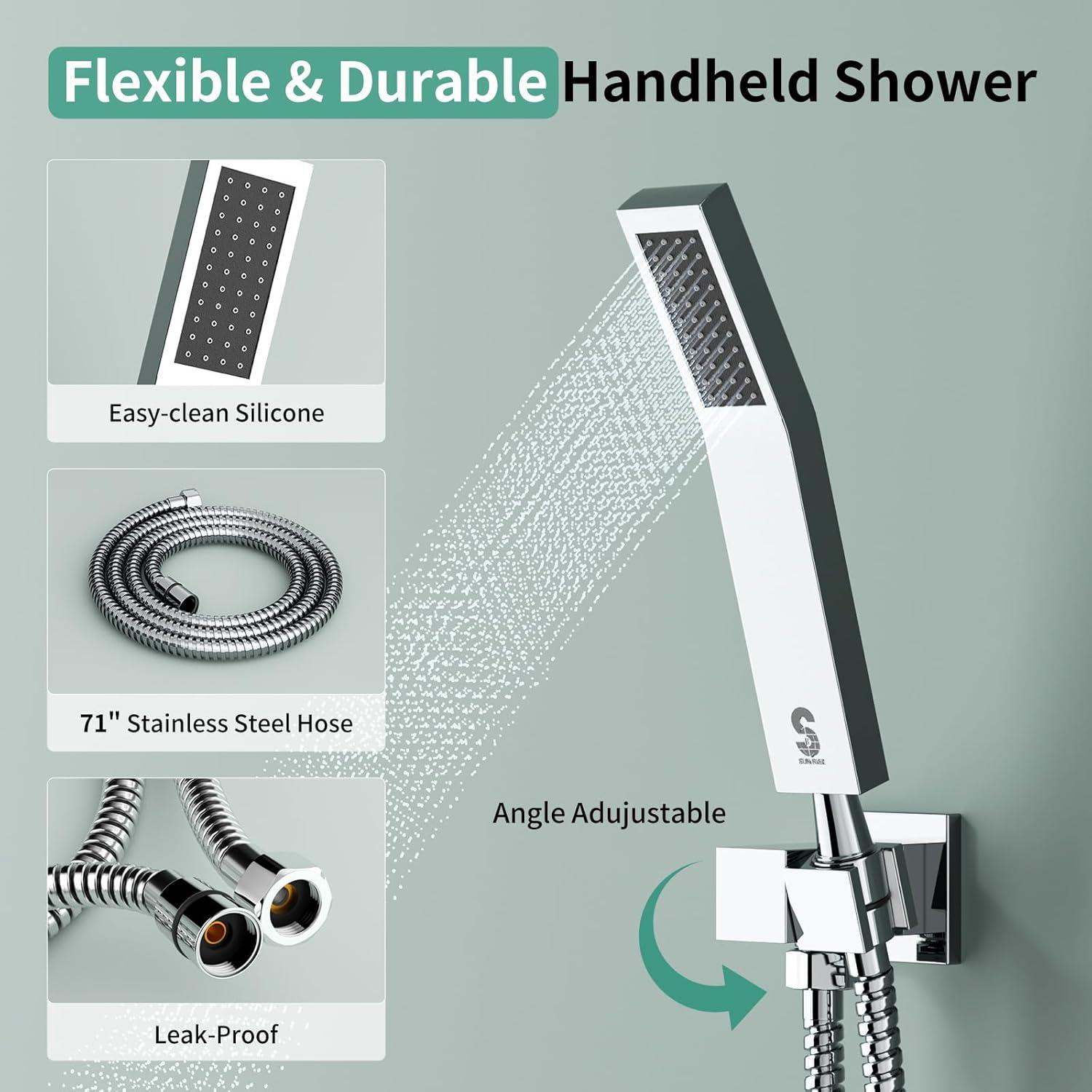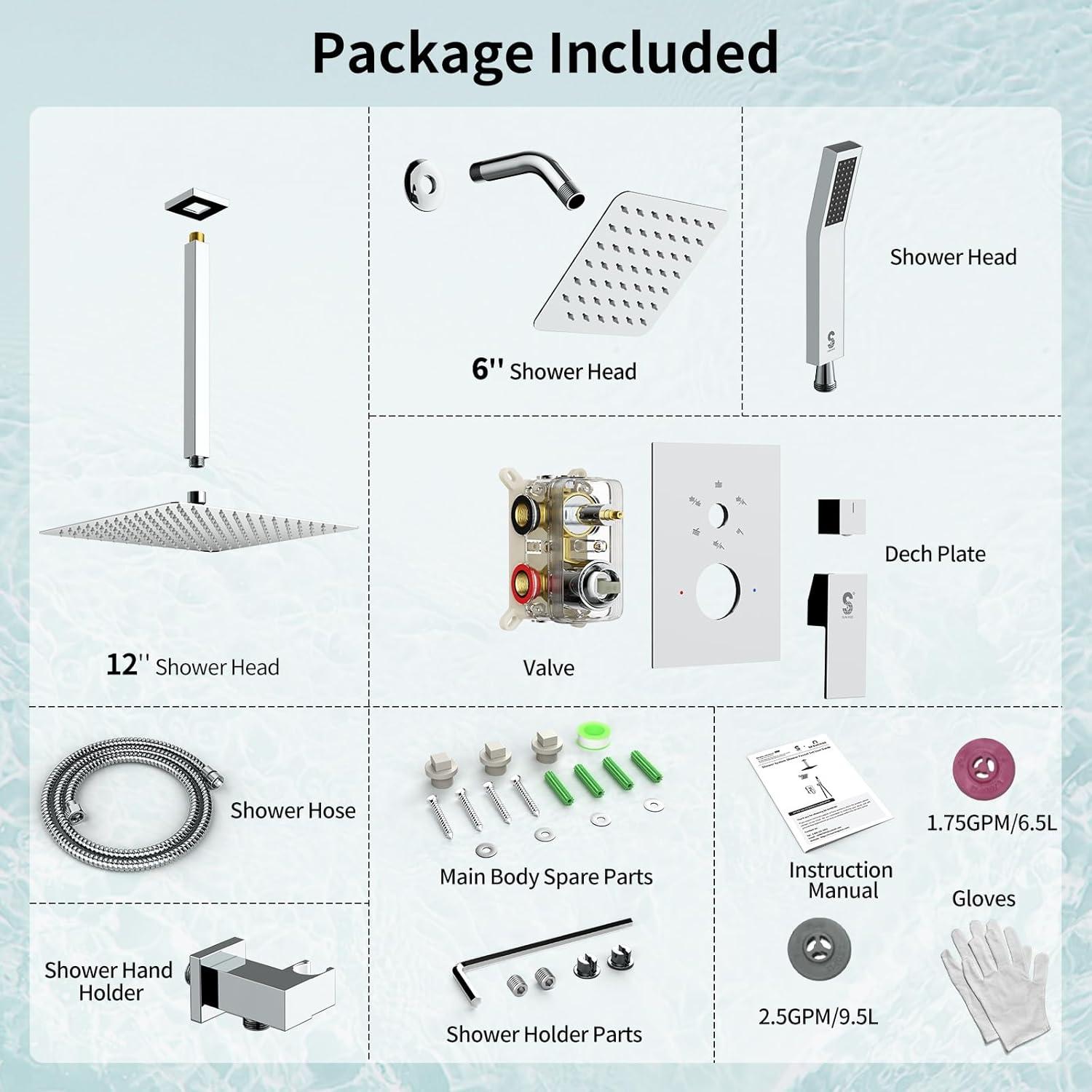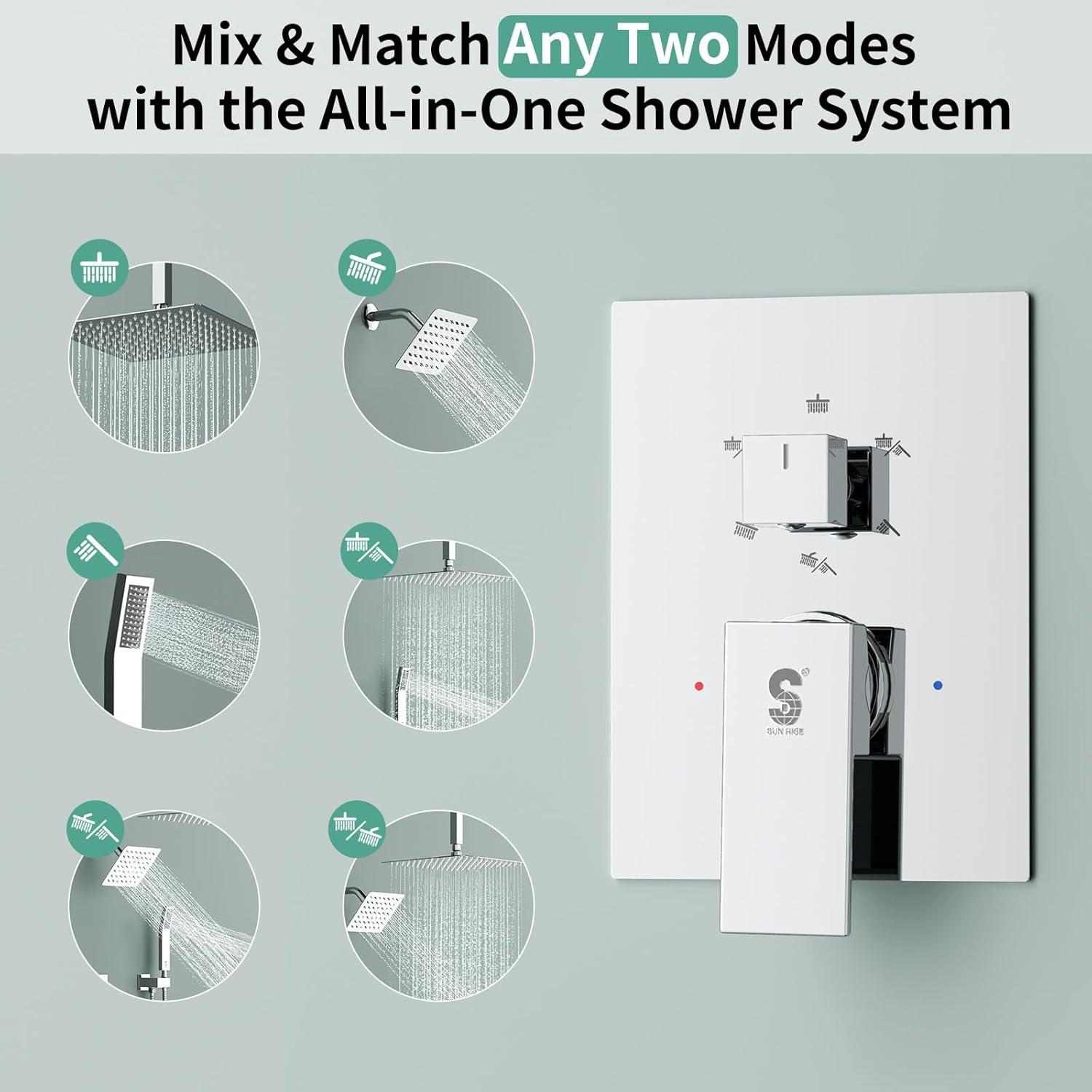 Dual Shower Head System: Includes a 12'' ceiling-mounted rainfall shower head, a 6'' wall-mounted shower head, a handheld spray with 71'' hose, and a pressure-balancing valve. Engineered with higher brass content for superior durability and corrosion resistance, this shower system provides 6 versatile spray modes to customize your shower experience.