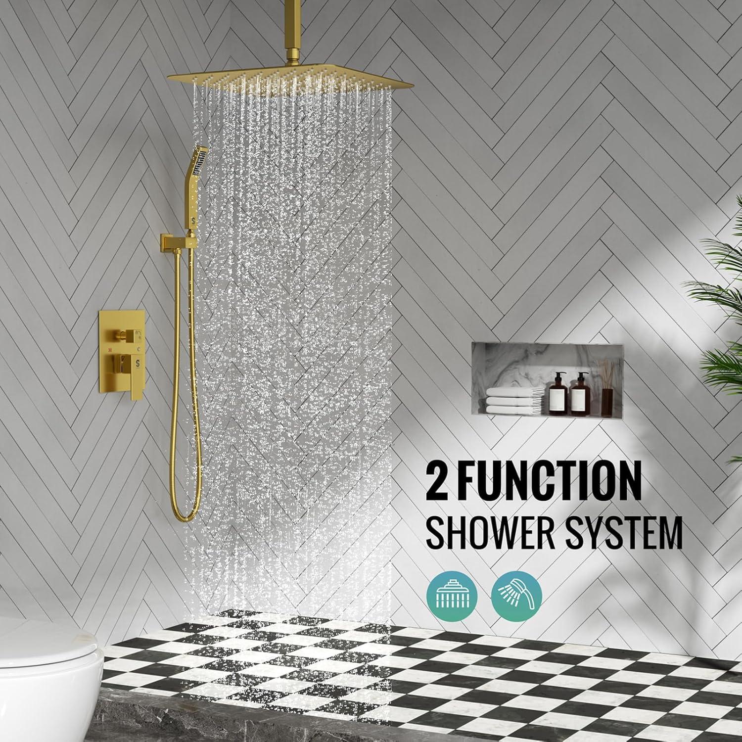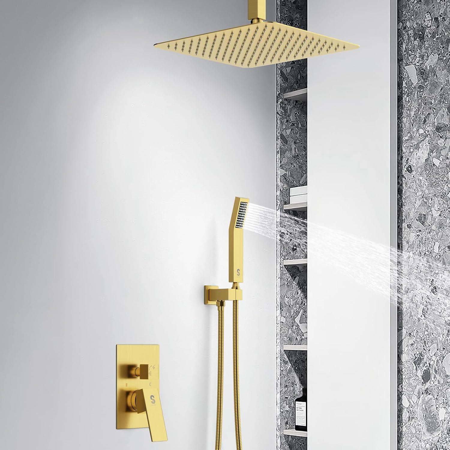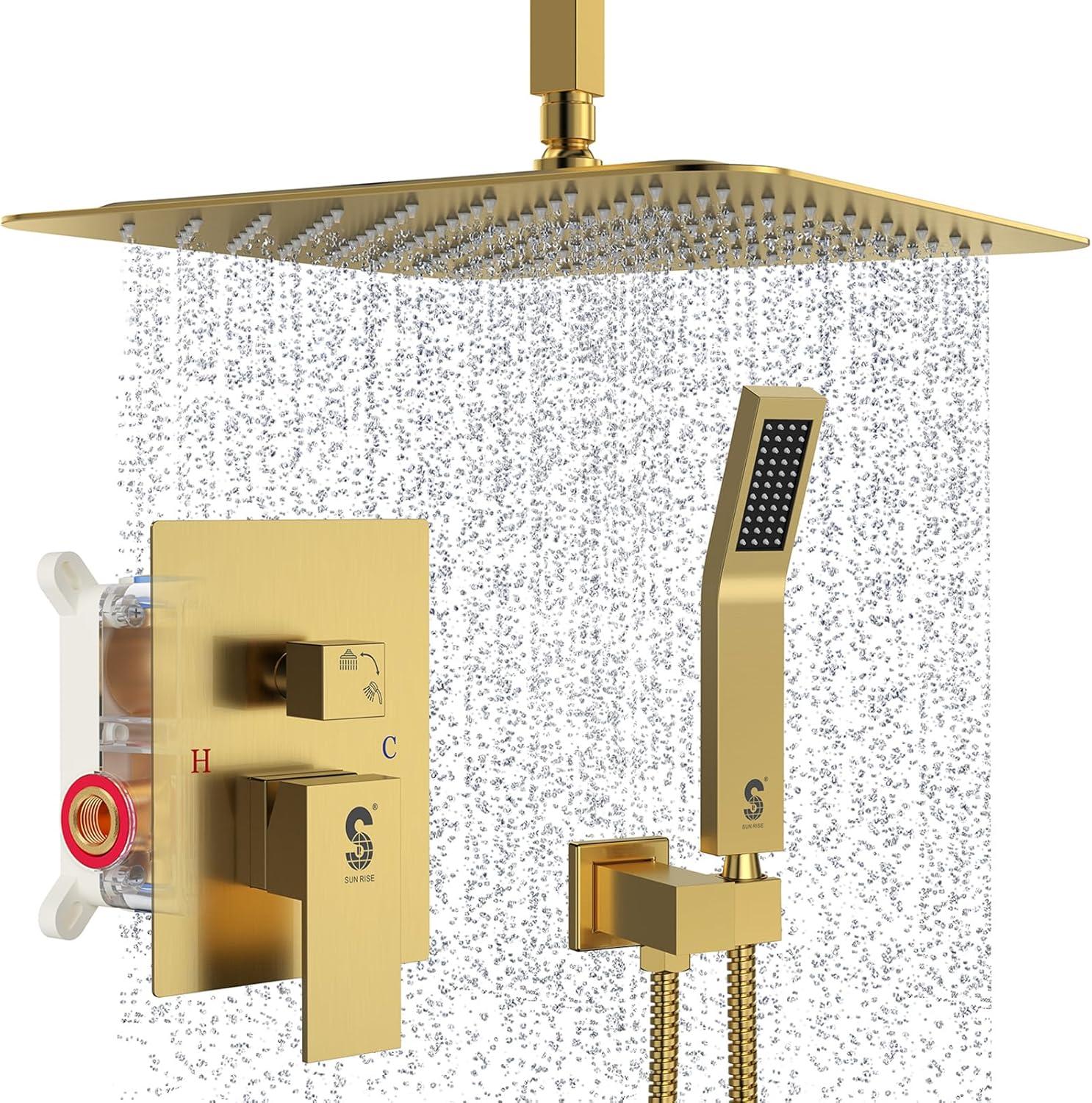 SR SUN RISE 12 Inch Ceiling Mount Matte Black Shower System Bathroom Luxury Rain Mixer Shower Faucet Set Ceiling Rainfall Shower Head System Faucet Trim Repair Kits Rough-in Valve and Trim Included(Brushed Gold)