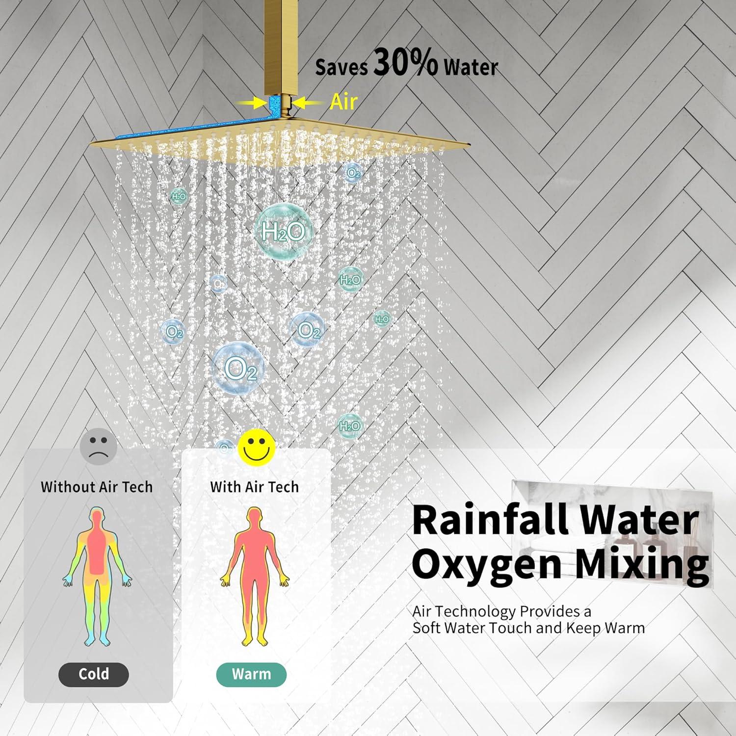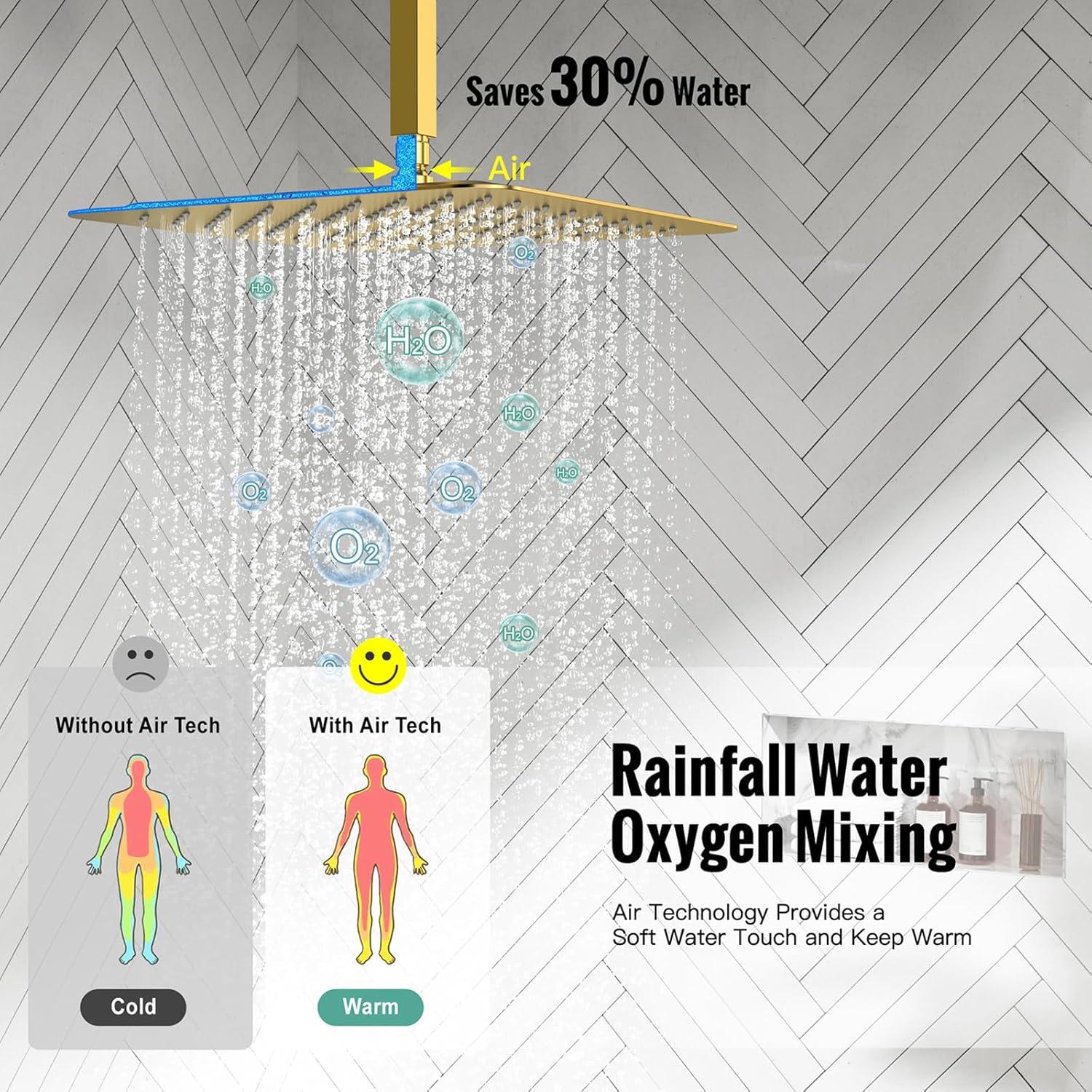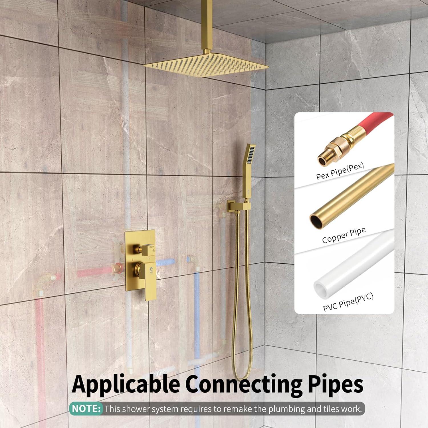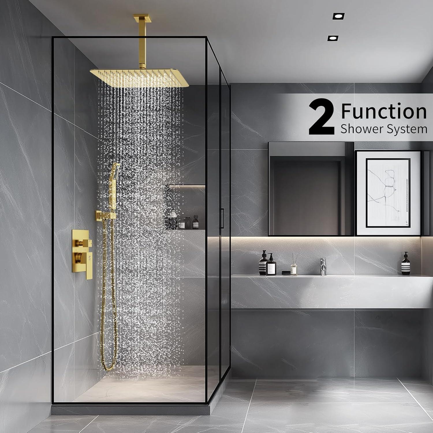 SR SUN RISE 12 Inch Ceiling Mount Matte Black Shower System Bathroom Luxury Rain Mixer Shower Faucet Set Ceiling Rainfall Shower Head System Faucet Trim Repair Kits Rough-in Valve and Trim Included(Brushed Gold)