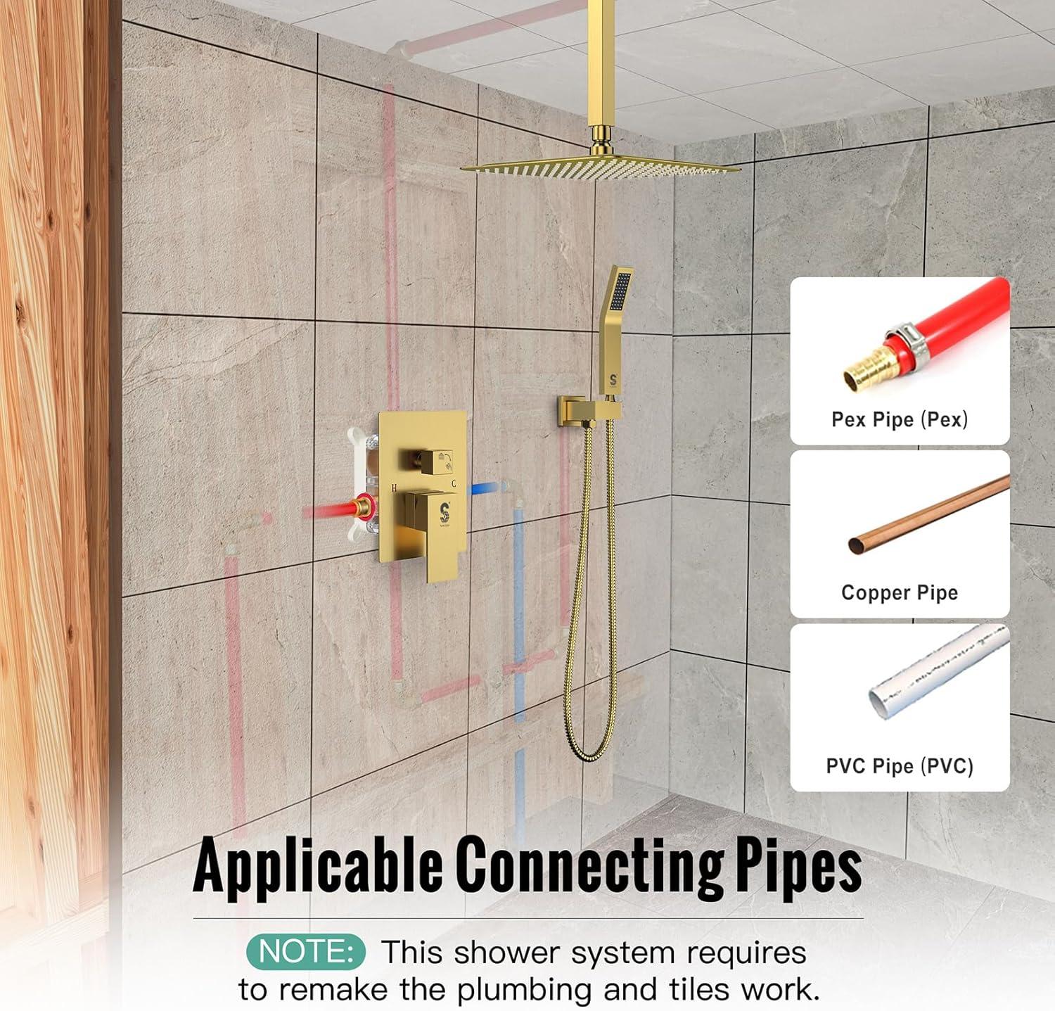imageSR SUN RISE 12 Inch Ceiling Mount Matte Black Shower System Bathroom Luxury Rain Mixer Shower Faucet Set Ceiling Rainfall Shower Head System Faucet Trim Repair Kits Roughin Valve and Trim IncludedBrushed Gold