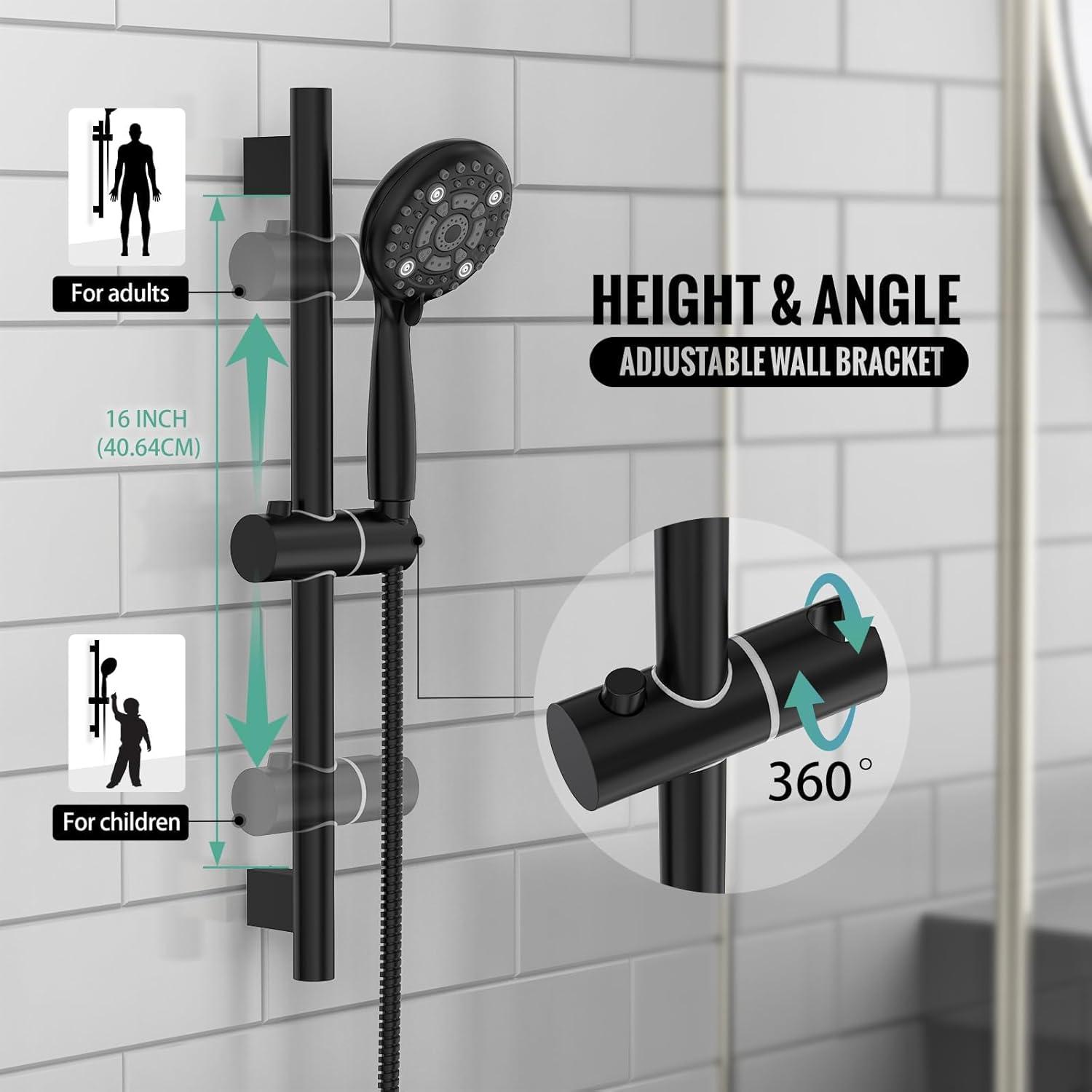 Adjustable 16 Inch Slide Bar: Included Slide Bar makes it easy to adjust the handheld shower height, wall bar with adjustable slide to accommodate different heights and unique needs. Provides safe and comfortable bathing and showering.