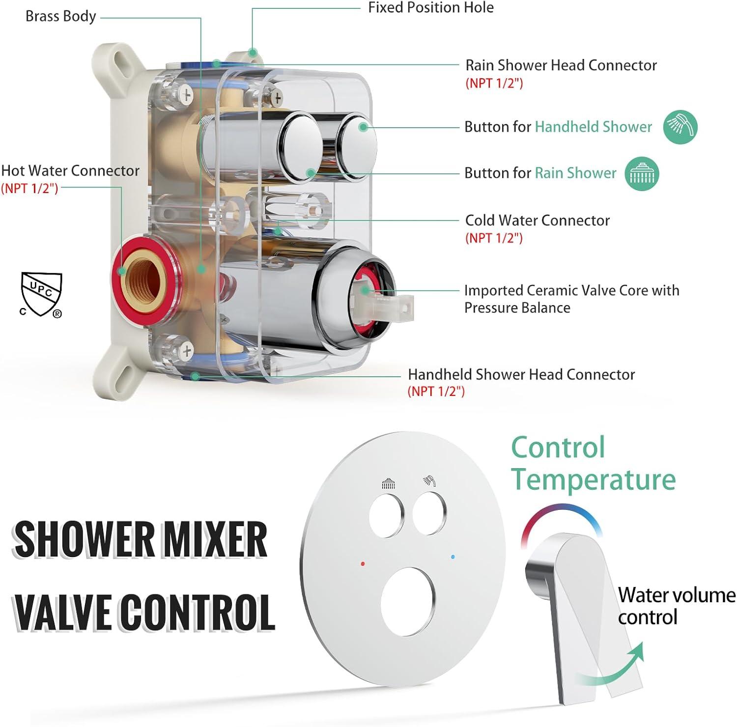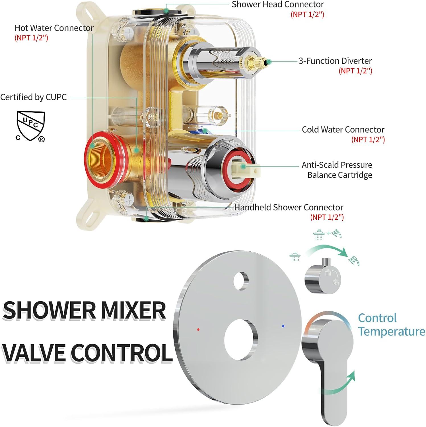 Prevent Water Hammer: This pressure balance valve has built-in Shut Off Stops to effectively prevent water hammer noise and control the water pressure. Pressure balance valve's cartridge monitors water pressure balance, helping to protect you from being scalded by sudden changes in hot or cold water pressure.