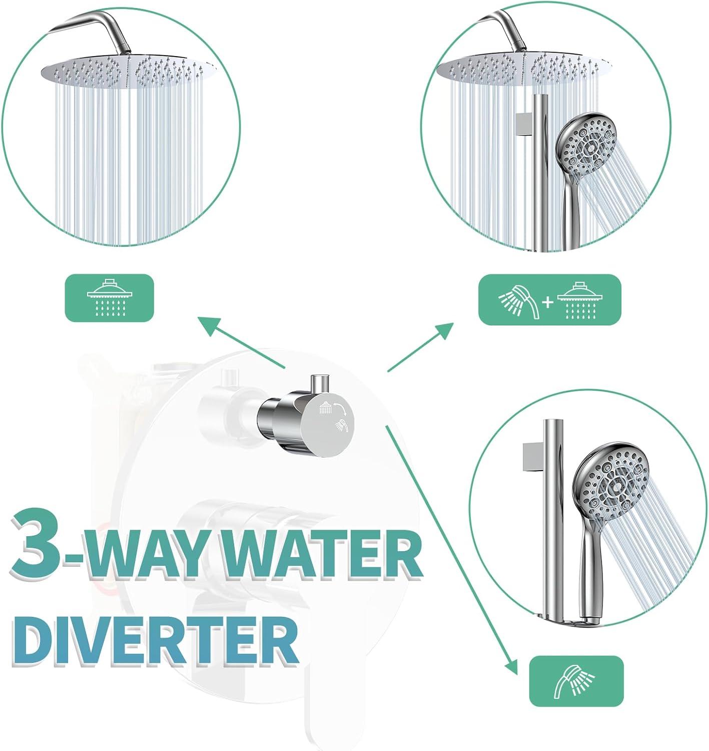 Enjoy Rain Shower and Handheld Together: If you are looking for a shower faucet that rain shower head and hand shower can work together, this 3-Way Diverter shower set is the best choice!