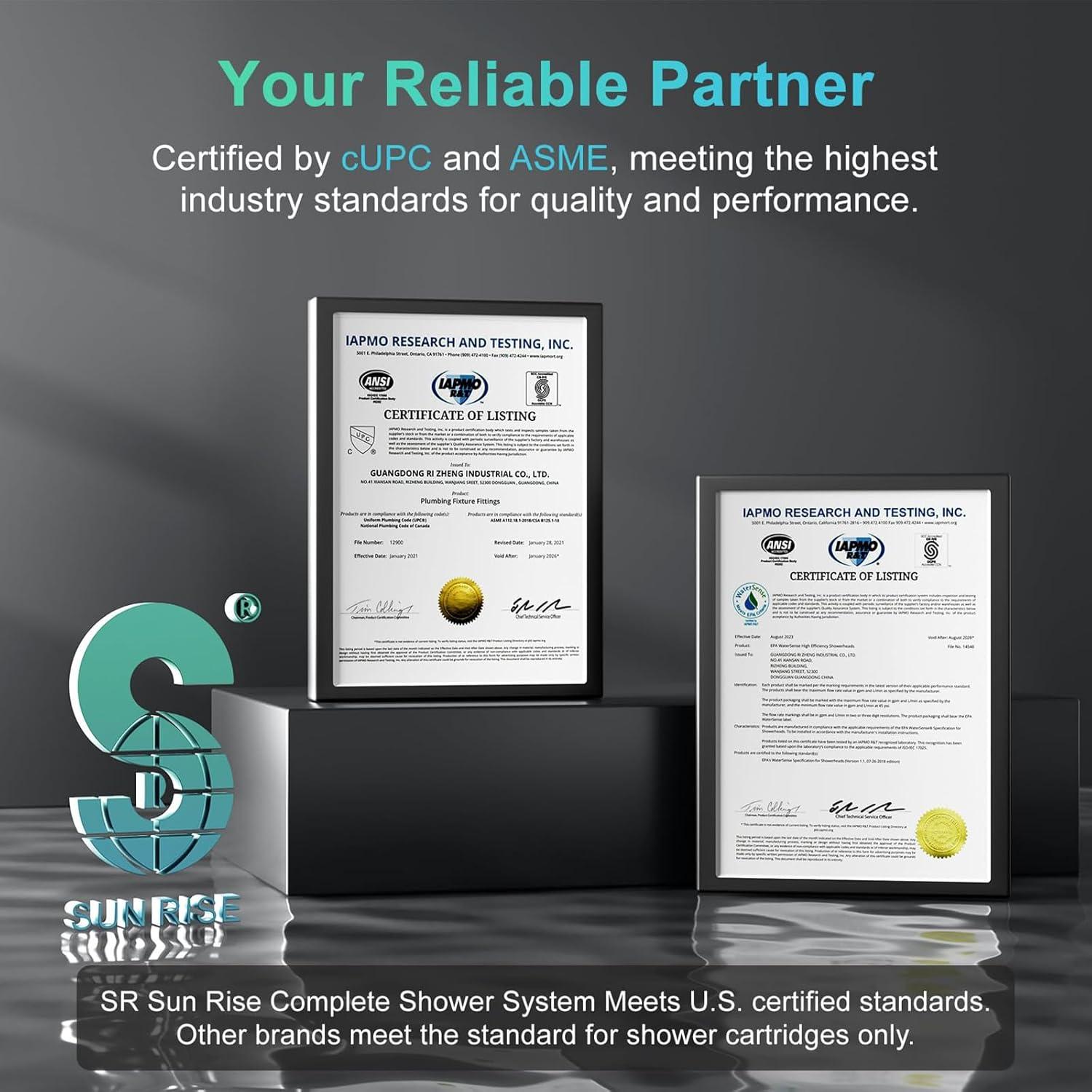 Install with Confidence: SR SUN RISE Shower System has cUPC Certification and compliance with the following standard(s): ASME A112.18.1-2018/CSA B125.1-18. Designed for use with standard 1/2″ U.S. plumbing connections. Approved by the California Energy Commission.