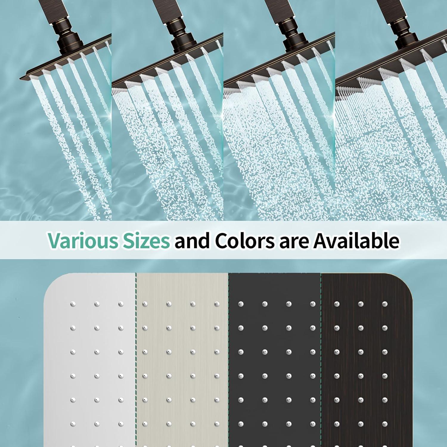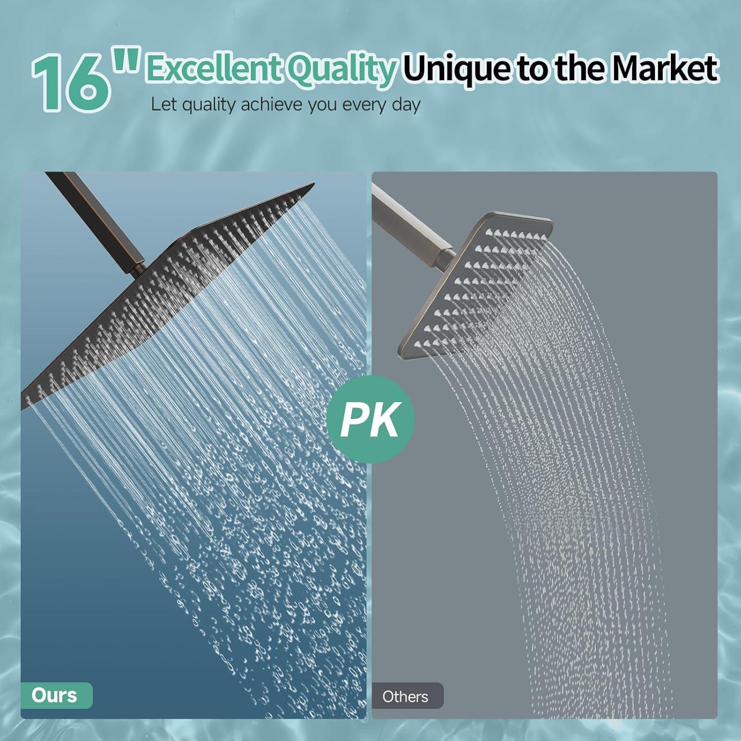 16 inch Large Rain Shower Head: Extra large for full-body body shower,keep your every skin bathing in warm water. The rainfall shower head with air energy technology to compensate for low water pressure situation to output water at a higher velocity, Recommended water pressure: 0.31 Pa above. 16'' supper large size, brings you 100% full-body High pressure shower.