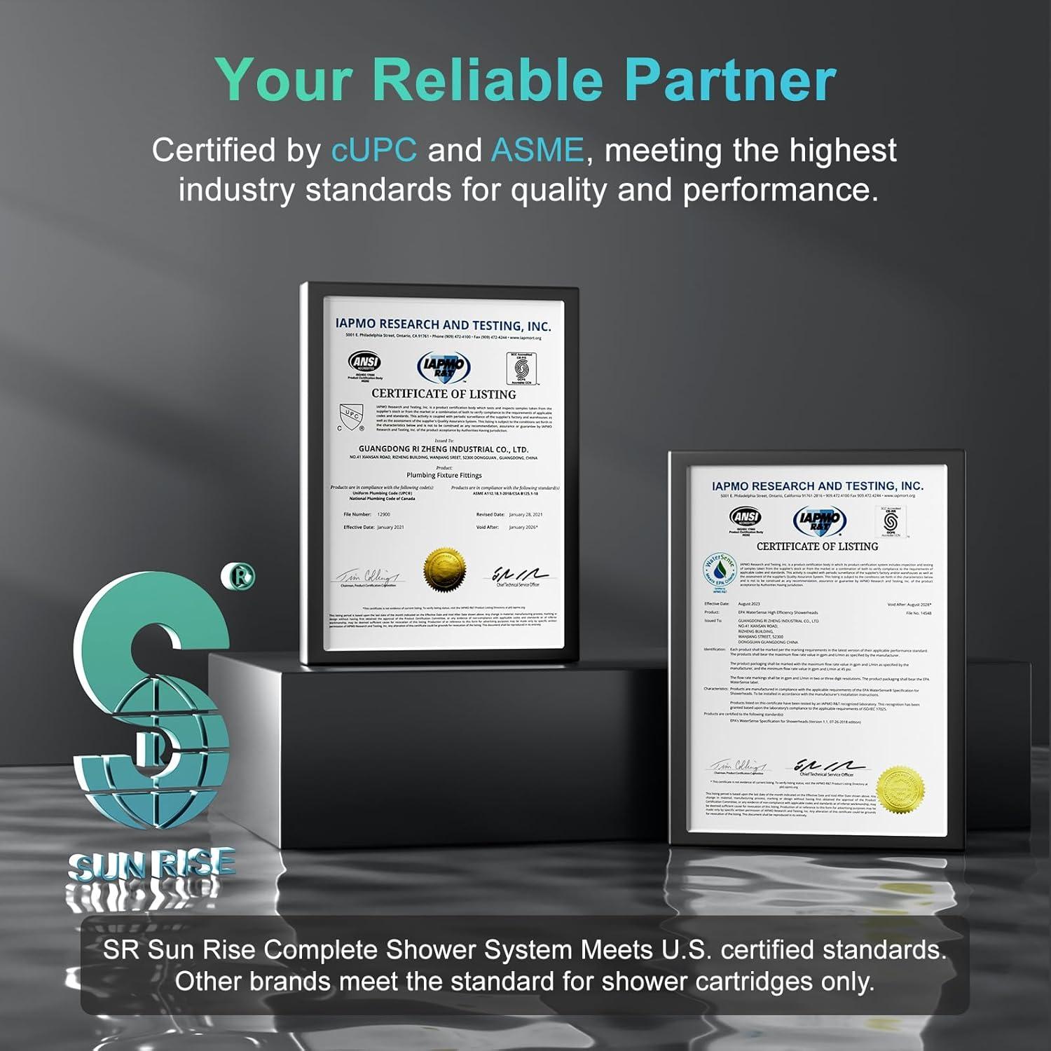 Install with Confidence: SR SUN RISE Shower System has cUPC Certification and compliance with the following standard(s): ASME A112.18.1-2018/CSA B125.1-18. Designed for use with standard 1/2″ U.S. plumbing connections. Approved by the California Energy Commission.