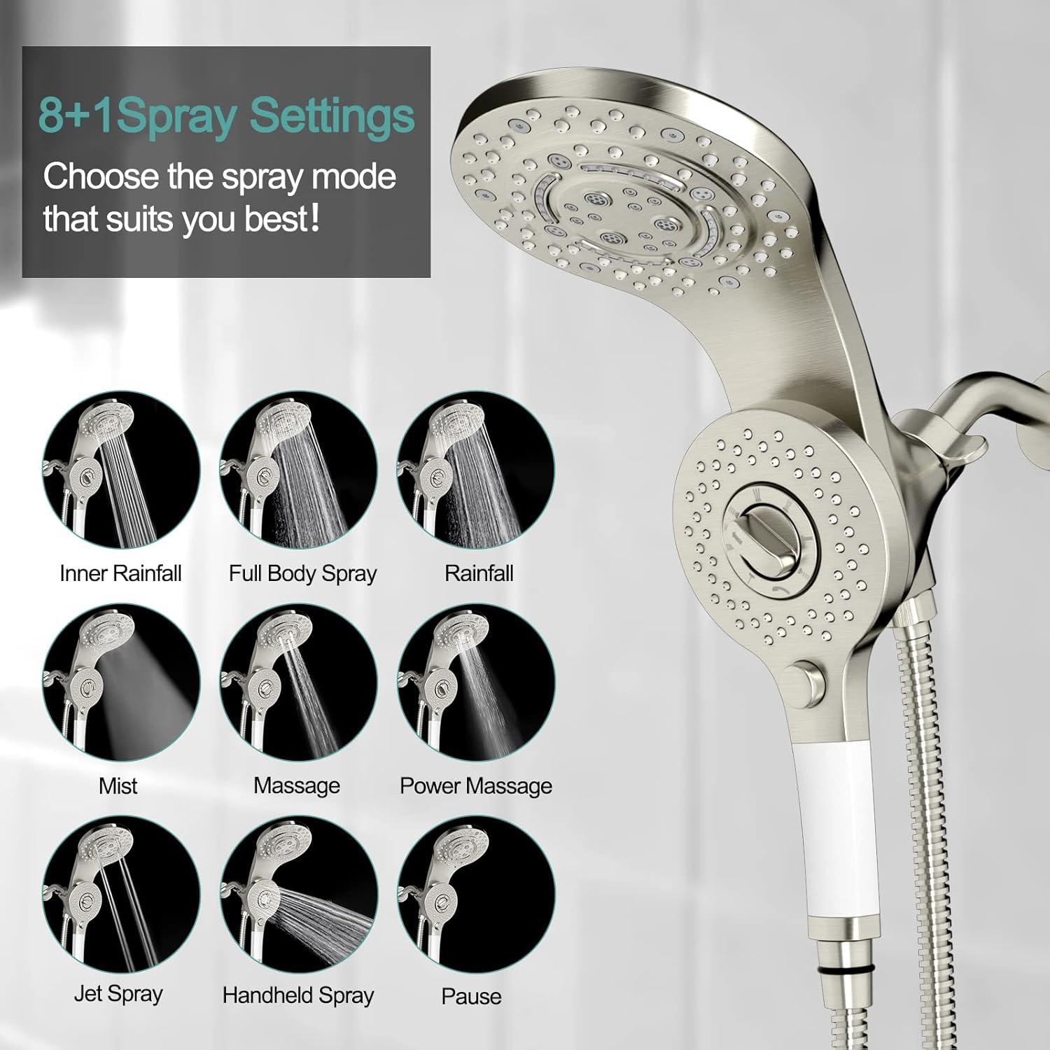 8+1 Spray Settings: Our shower head water pressure is brilliant, you can save your shower time even with a very long hair. You can enjoy Massage, Full Spray and body spray in 1 shower wand and ON/OFF for saving water