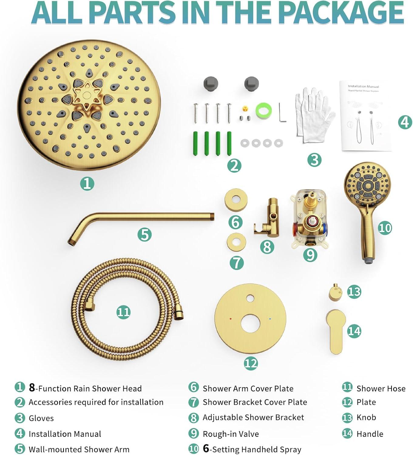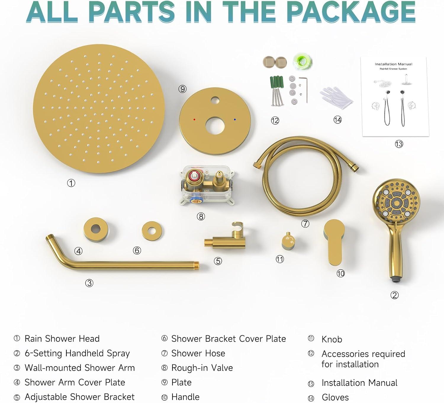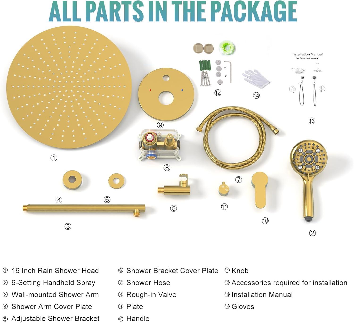 You Will Get: 10 Inch Rain Shower Head(ABS with Brass Ball Joint), 6 Settings Hand Shower(ABS), 16 Inch Wall Mounted Shower Arm(304 Stainless Steel), Rough-in Valve and Trims(Solid Brass), Shower Bracket(Solid Brass), 71 Inch Shower Hose(304 Stainless Steel) and Accessories Required for Installation.