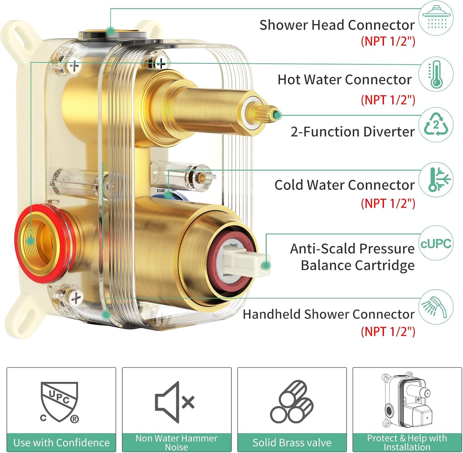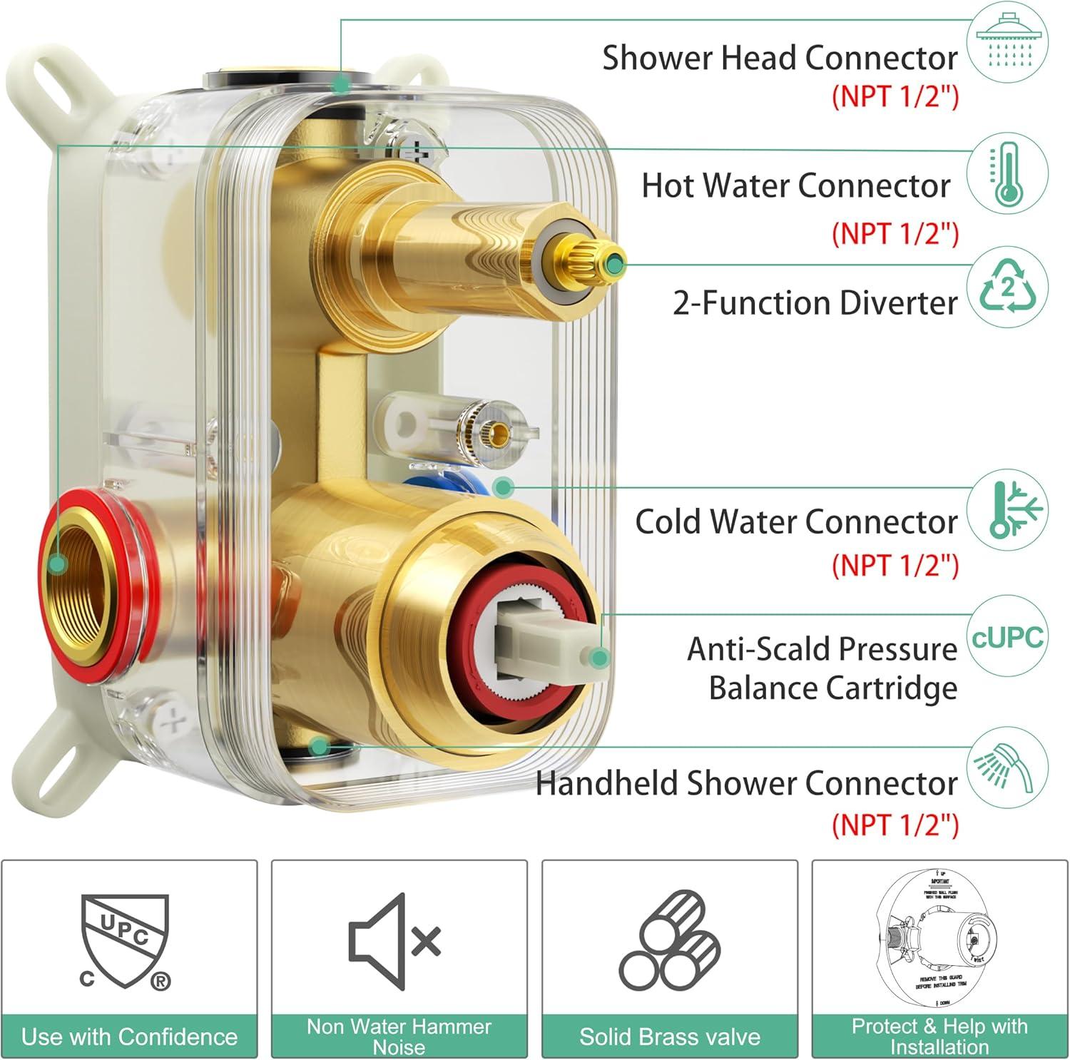 Prevent Water Hammer: The pressure balance valve has built-in two check valves to effectively eliminate water hammer noise. The pressure balance valve's cartridge monitors water pressure balance, helping to protect you from being scalded by sudden changes in hot or cold water pressure.