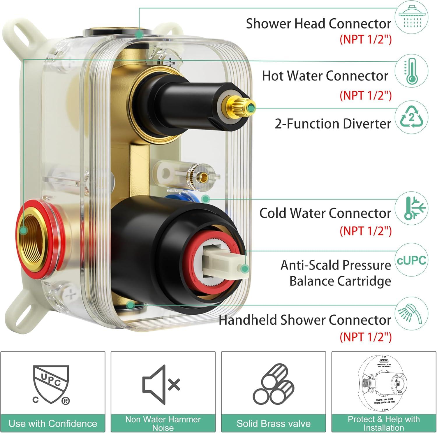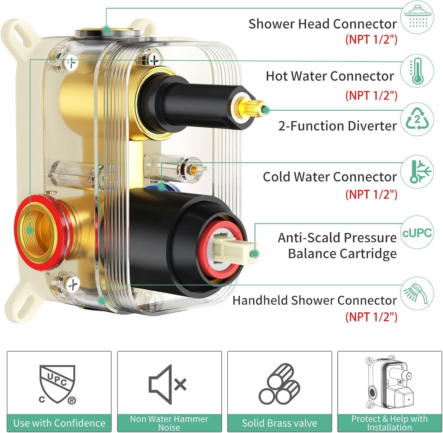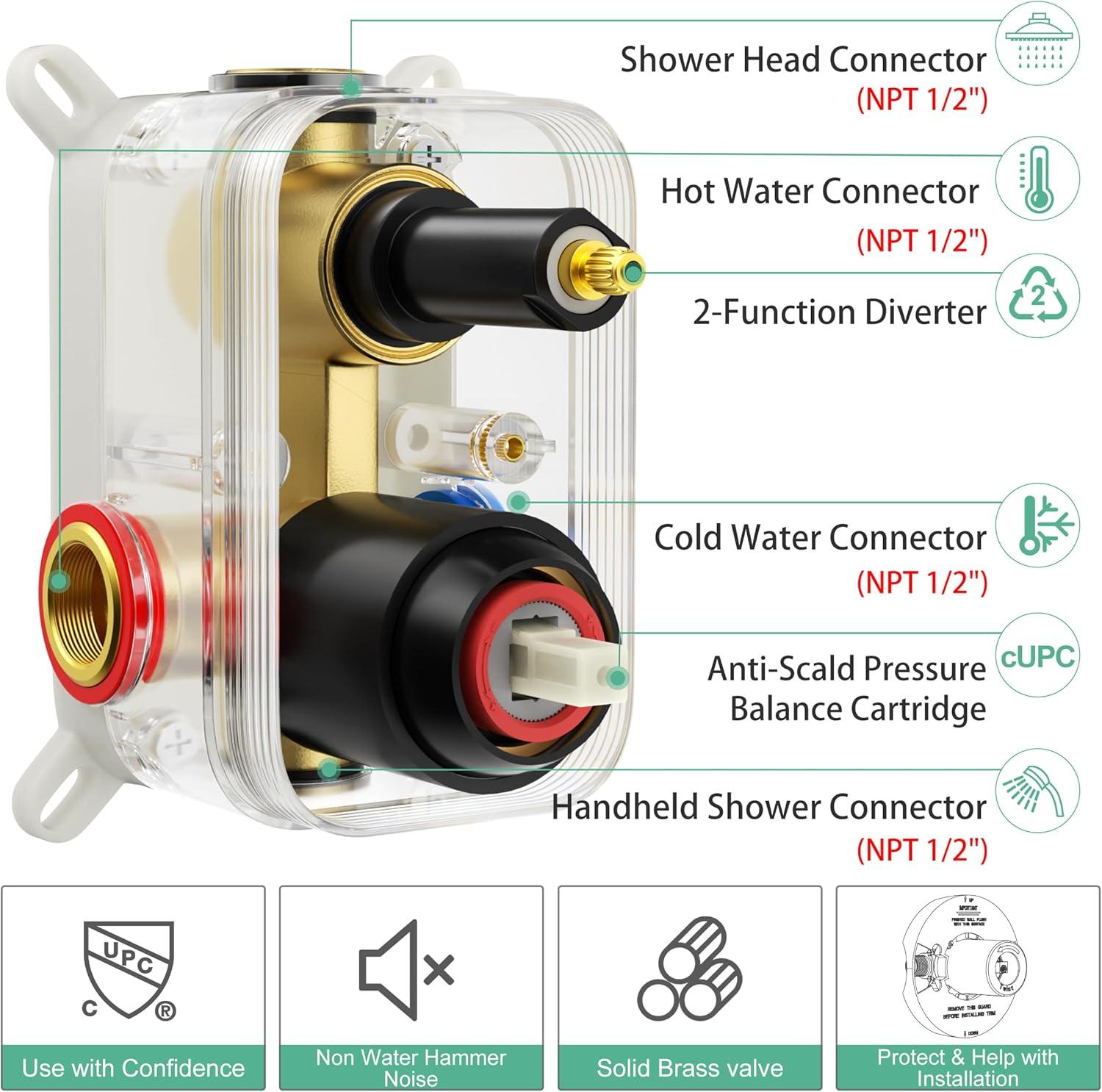 Prevent Water Hammer: The pressure balance valve has built-in two check valves to effectively eliminate water hammer noise. The pressure balance valve's cartridge monitors water pressure balance, helping to protect you from being scalded by sudden changes in hot or cold water pressure.