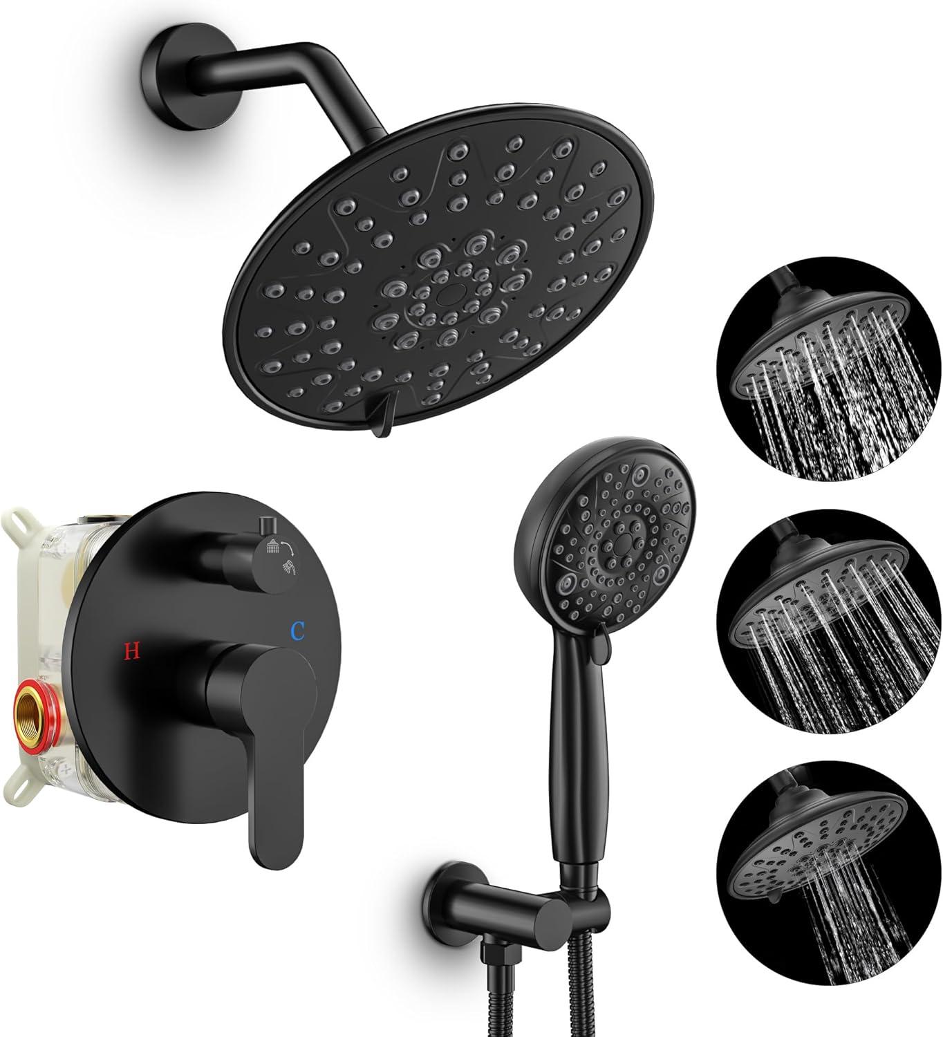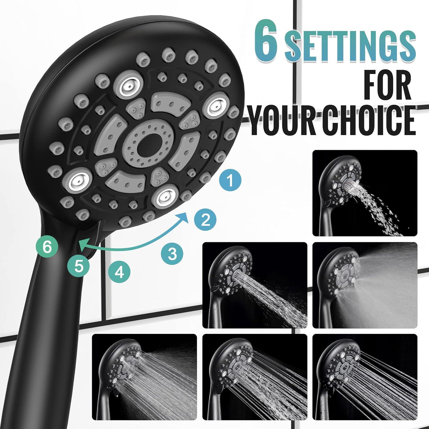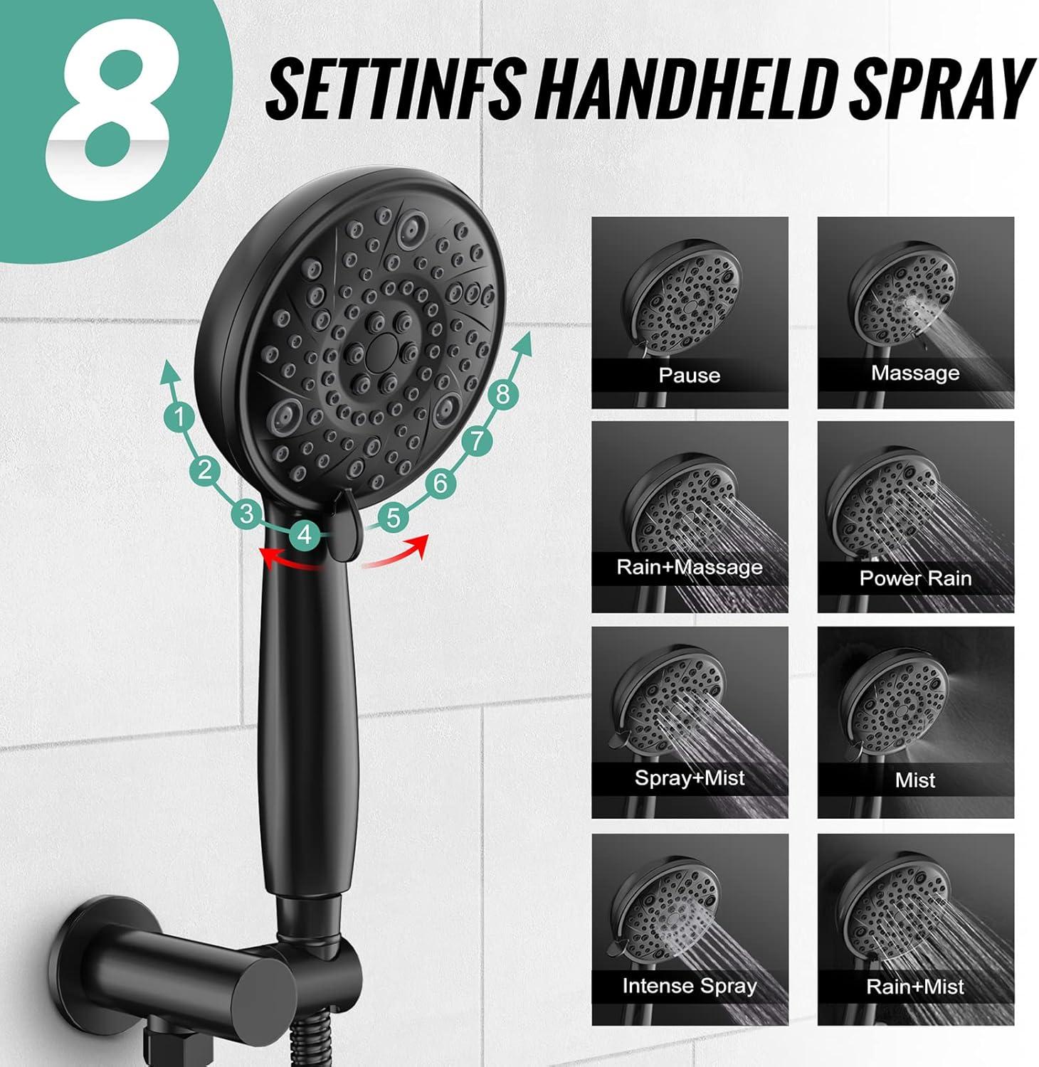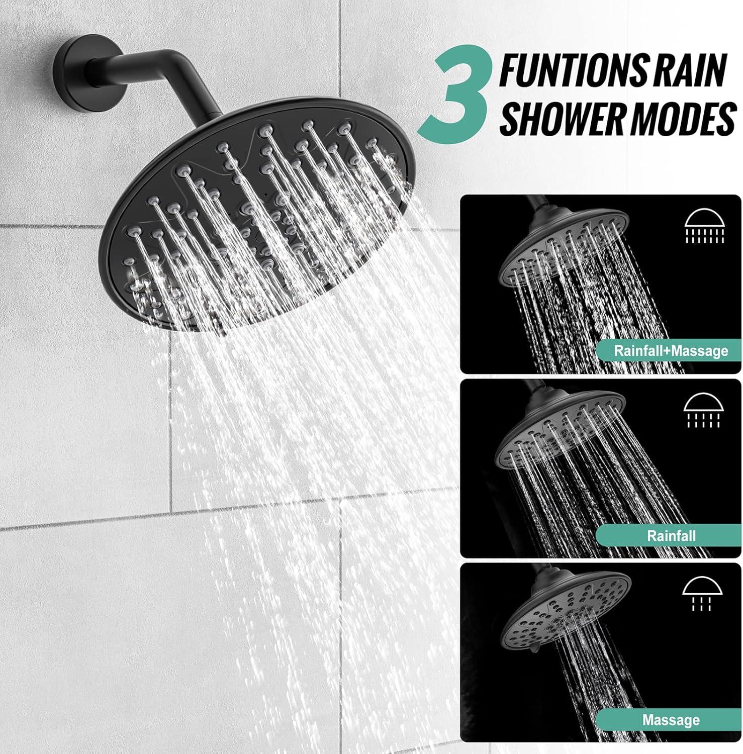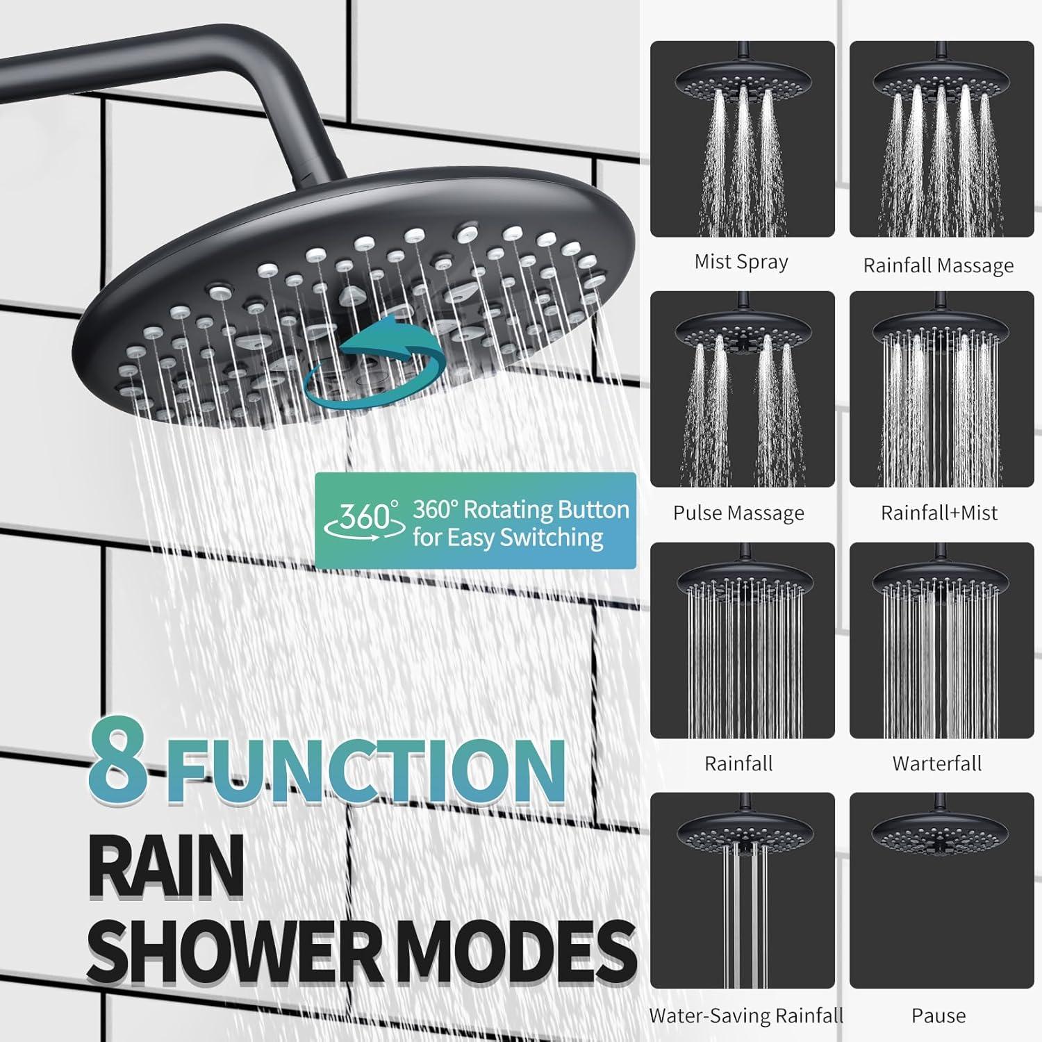 8-Modes Rainfall Shower Head: 10 Inch Rain Shower Head features a 360° rotating button for easy adjustment of its 8 rainfall modes. The soft silicone nozzles easily remove accumulated minerals for long-lasting performance. 6-Function Handheld Spray: Handheld shower head featuresRainfall, Rainfall+Trickle, Power Massage, Rainfall+Spray, Power Spray, Water Save Trickle. Like our other shower head, it adjusts easily for optimal performance in low water pressure environments.