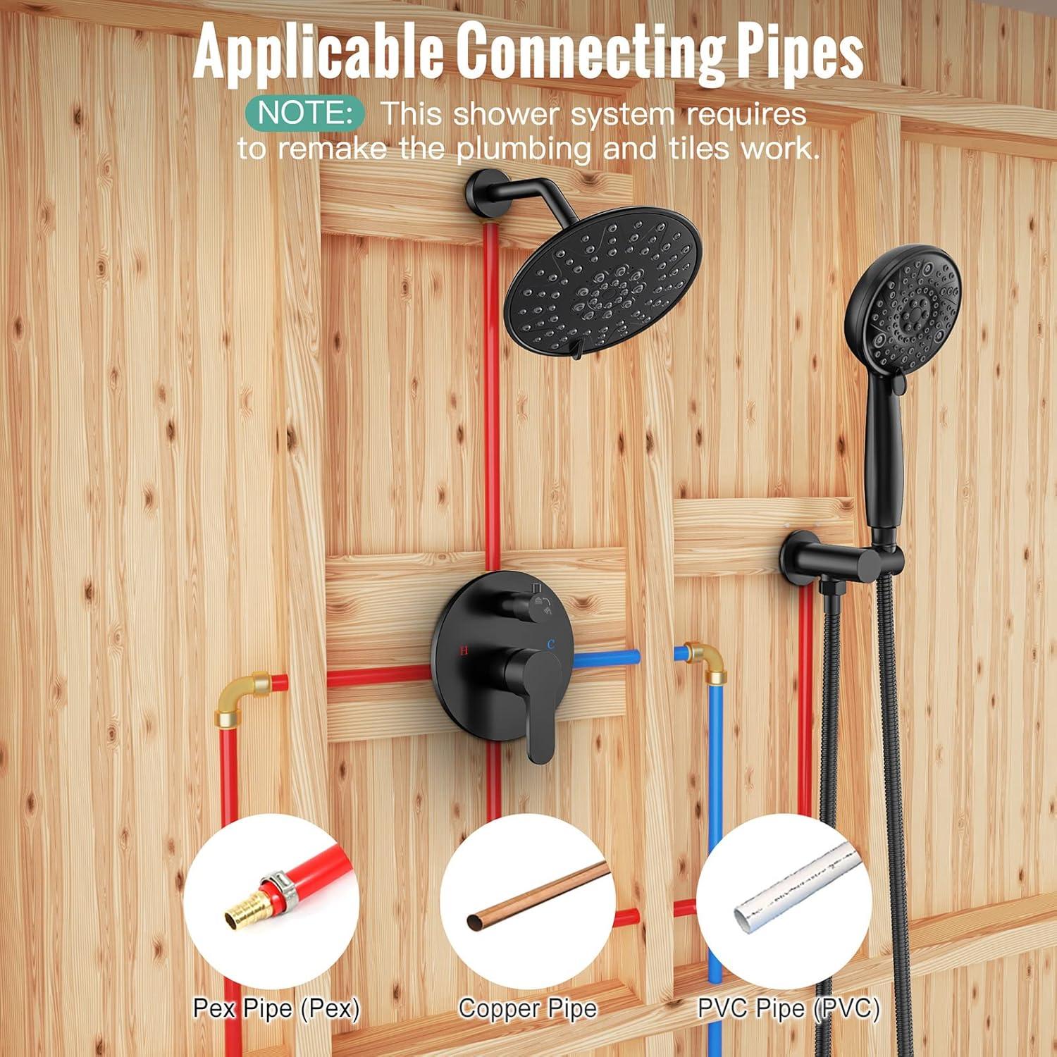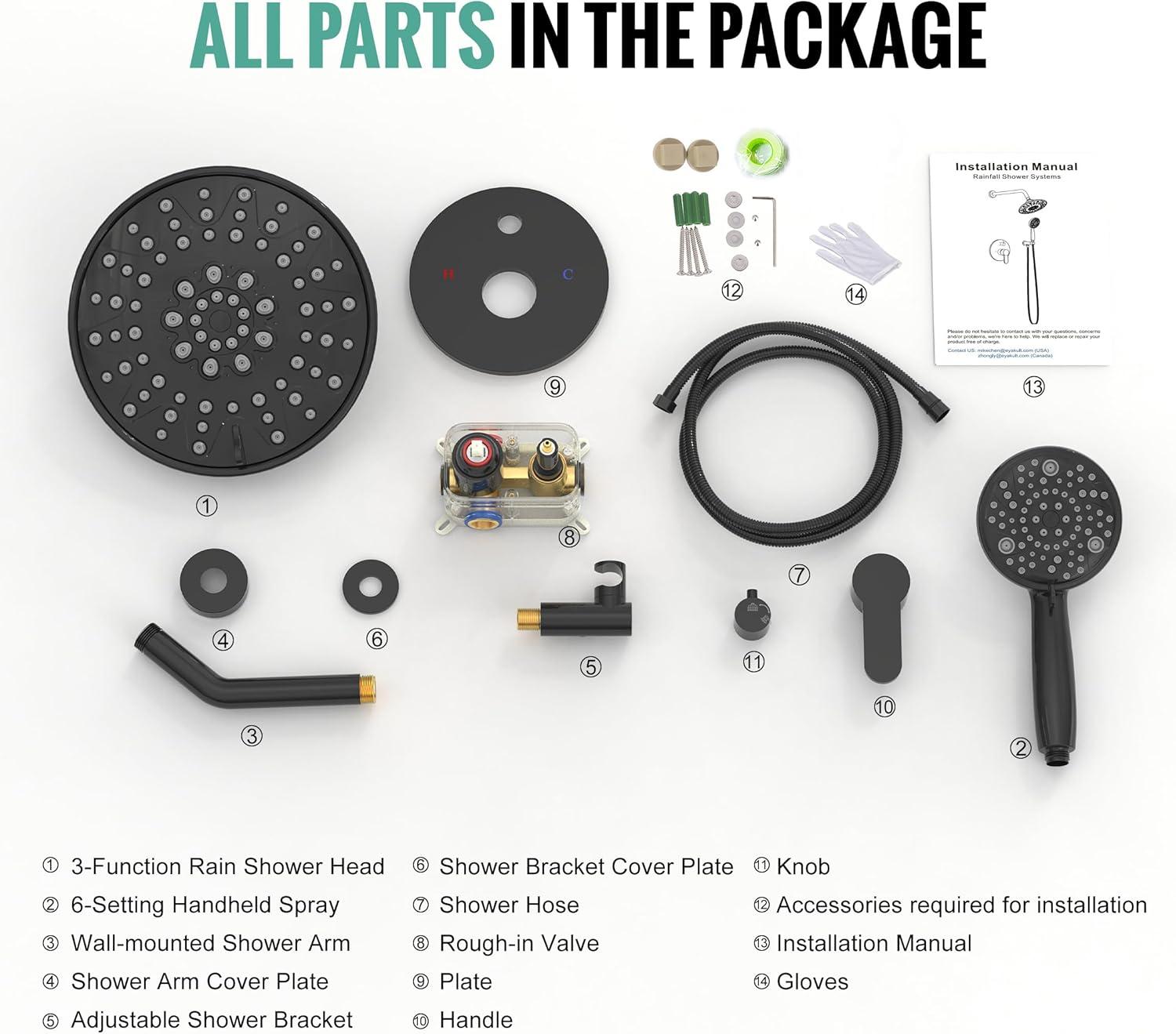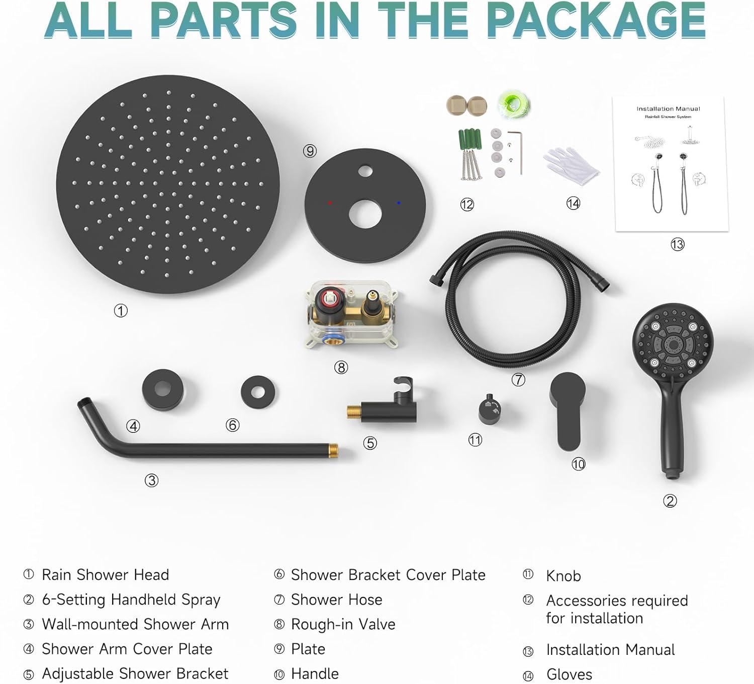 You Will Get: 10 Inch Rain Shower Head(ABS with Brass Ball Joint), 6 Settings Hand Shower(ABS), 16 Inch Wall Mounted Shower Arm(304 Stainless Steel), Rough-in Valve and Trims(Solid Brass), Shower Bracket(Solid Brass), 71 Inch Shower Hose(304 Stainless Steel) and Accessories Required for Installation.