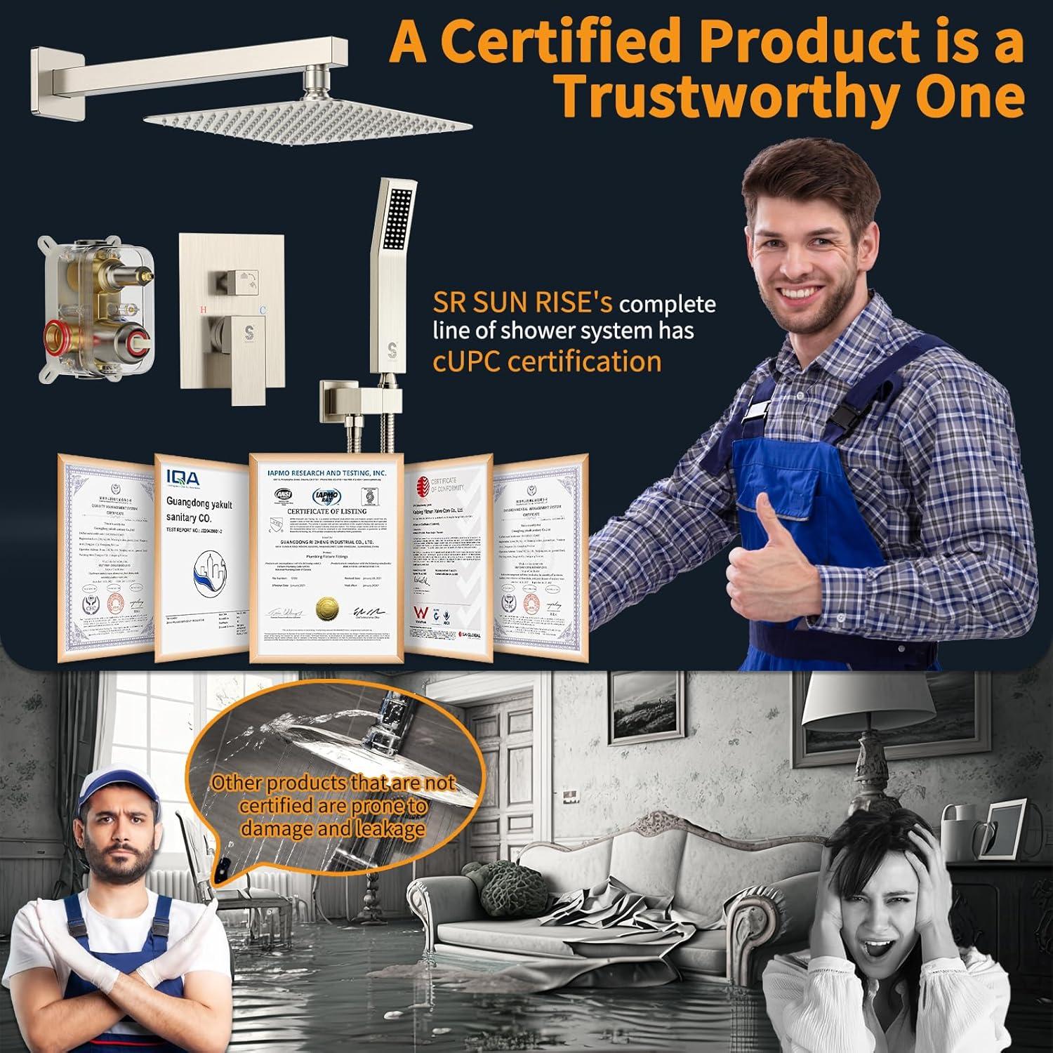 imageSR SUN RISE Shower Faucet Set Bathroom Square Rain Shower Head with Handheld Spray Wall Mounted Rainfall Shower Fixtures Brushed Nickel Shower Faucet Trim Repair Kits Contain Shower Valve10 InchesBrushed Gold