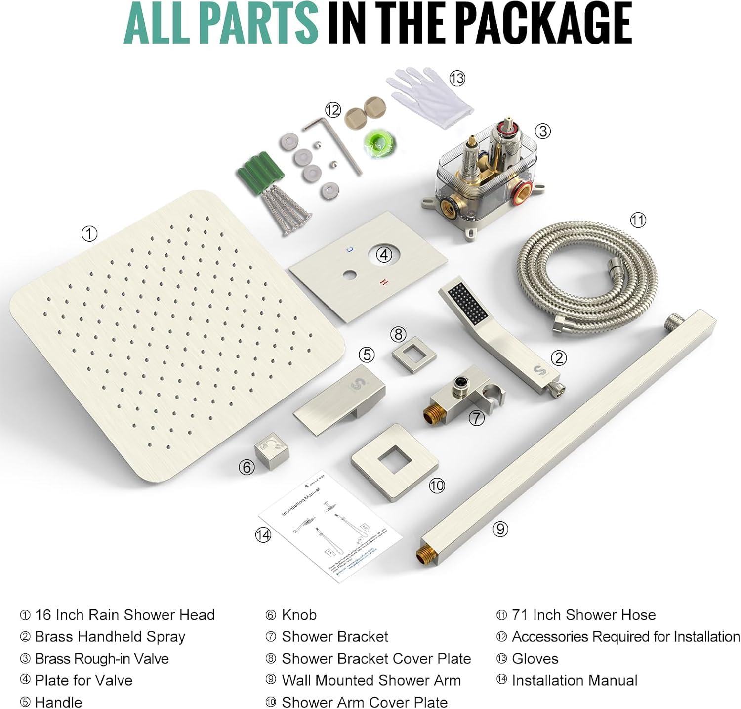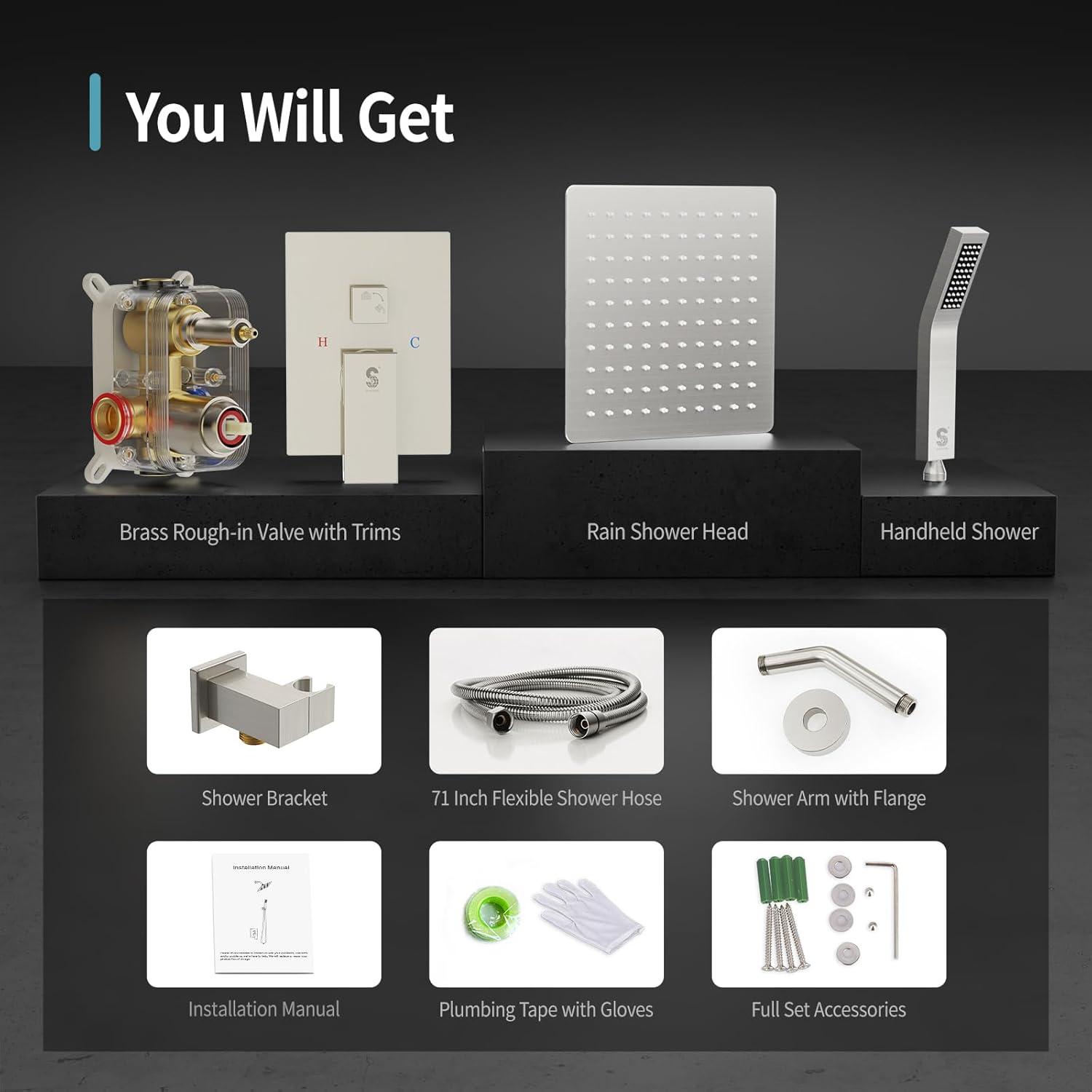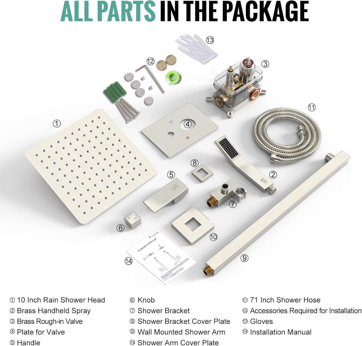 Complete Shower System Included: This shower faucet set includes everything you need for a luxurious upgrade: a 10-inch rain shower head, a handheld shower head, a 71-inch shower hose, a 16-inch shower arm, a handheld bracket, a mixing valve, a panel, a handle, a mode knob, shower arm and bracket covers, and all necessary installation accessories.