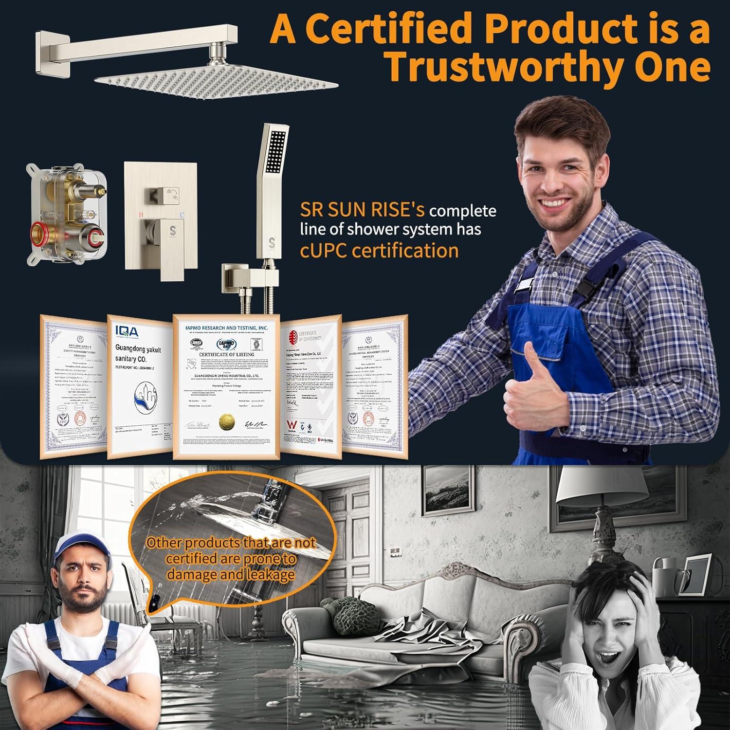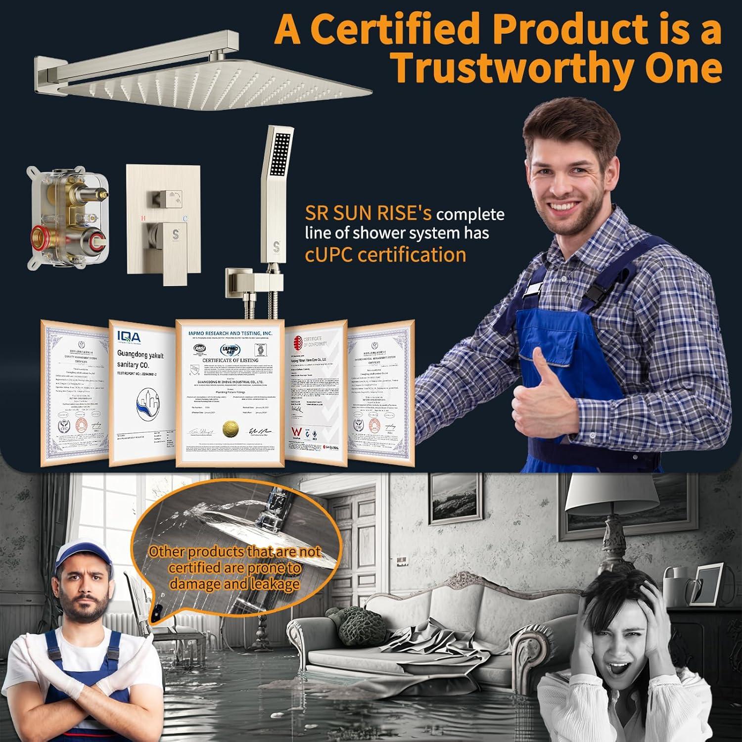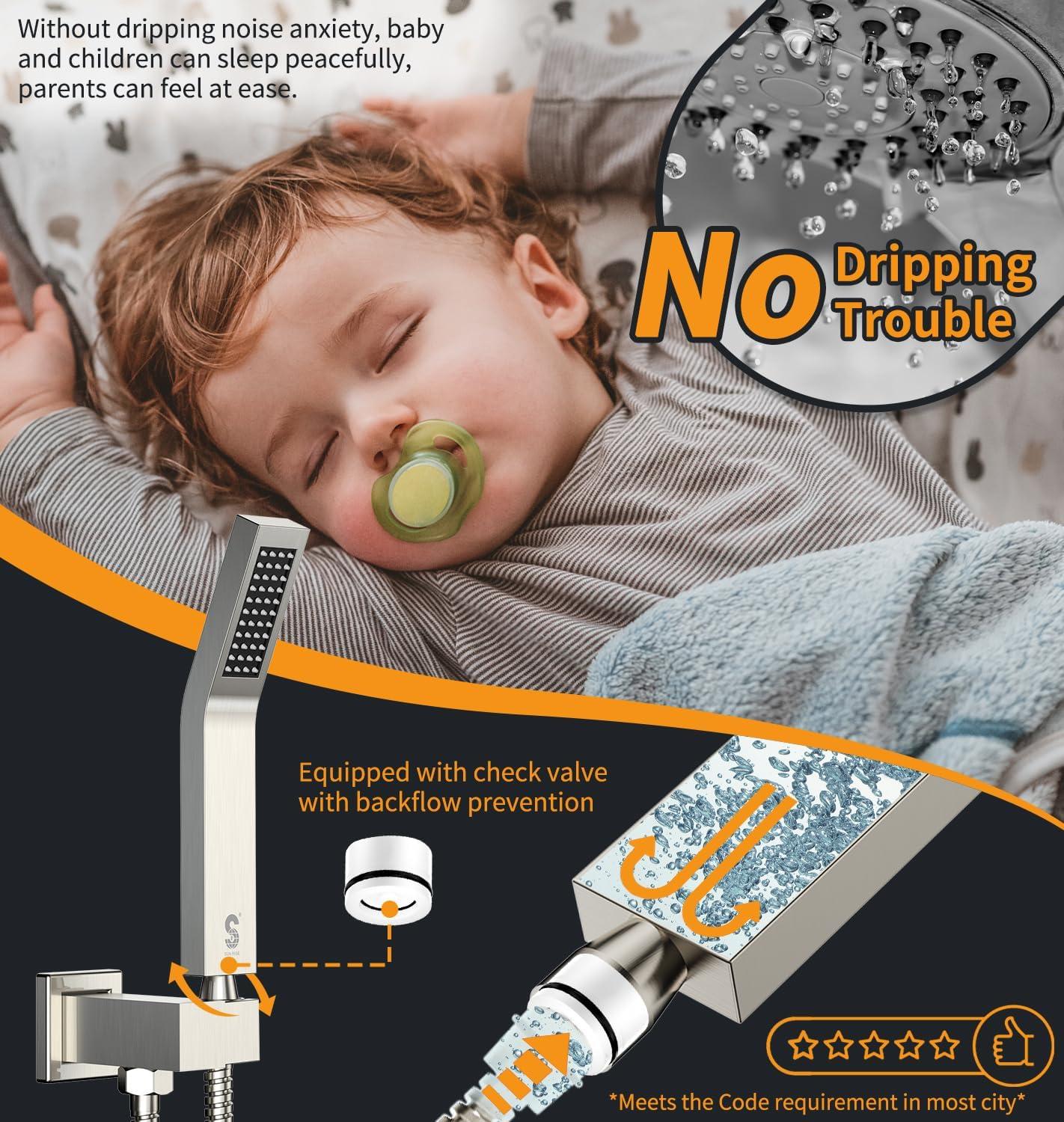 Reliable Support & Certified Safety: Backed by 24/7 customer support, this Rain Shower Head and Handle Set ensures a stress-free experience. It features a cUPC certified pressure balance valve with built-in check valves to monitor water pressure and prevent scalding, approved by the California Energy Commission for standard 1/2-inch US pipe connections.