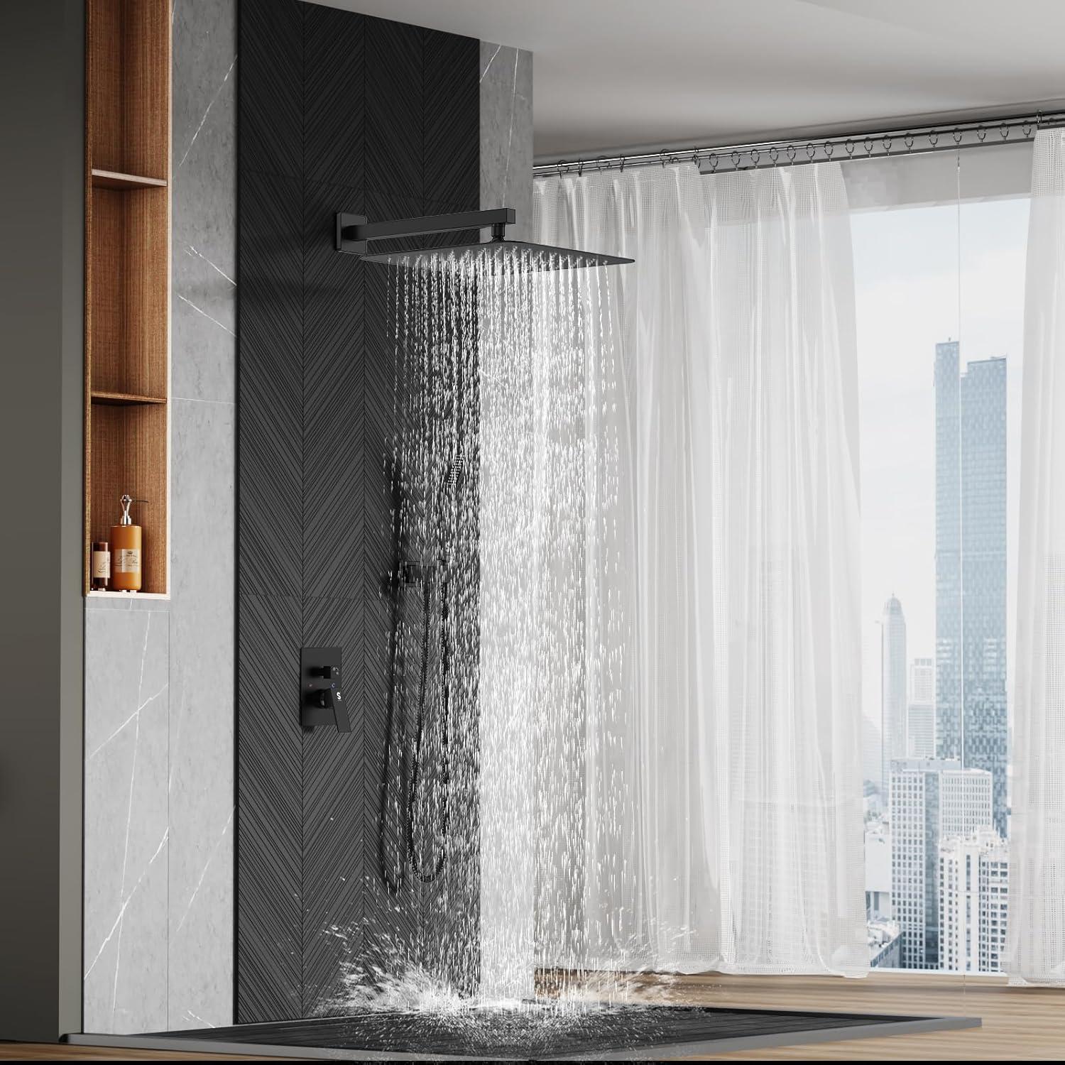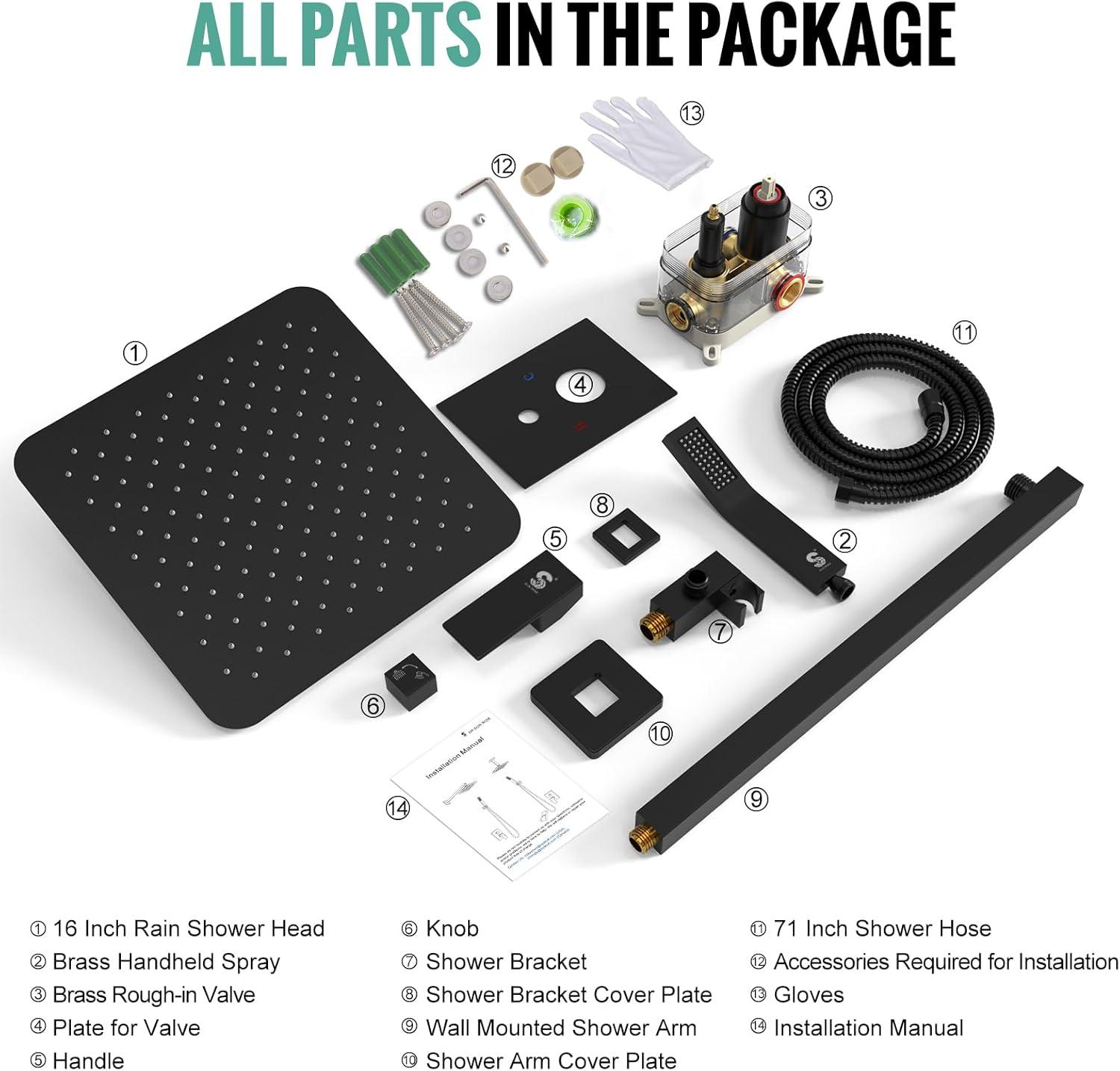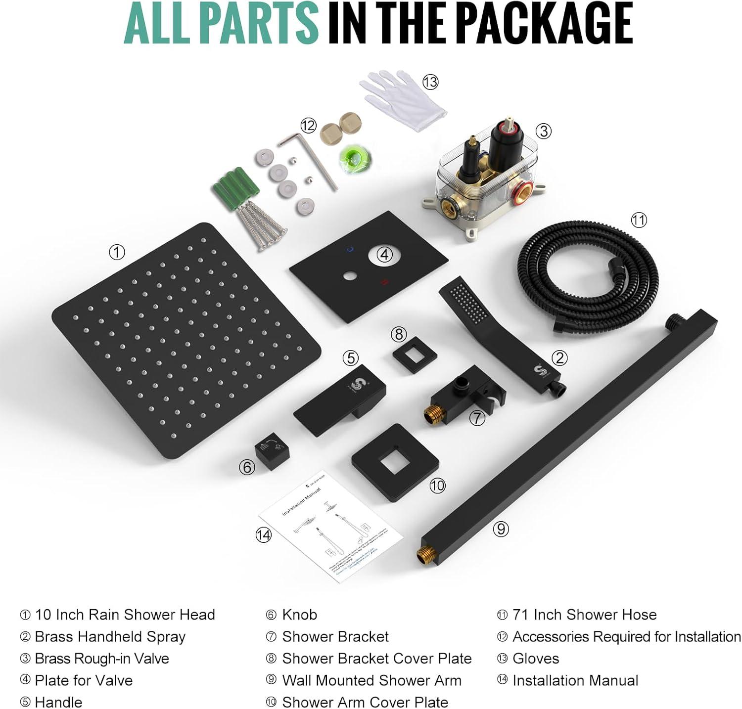 Complete Shower System Included: This shower faucet set includes everything you need for a luxurious upgrade: a 10-inch rain shower head, a handheld shower head, a 71-inch shower hose, a 16-inch shower arm, a handheld bracket, a mixing valve, a panel, a handle, a mode knob, shower arm and bracket covers, and all necessary installation accessories.