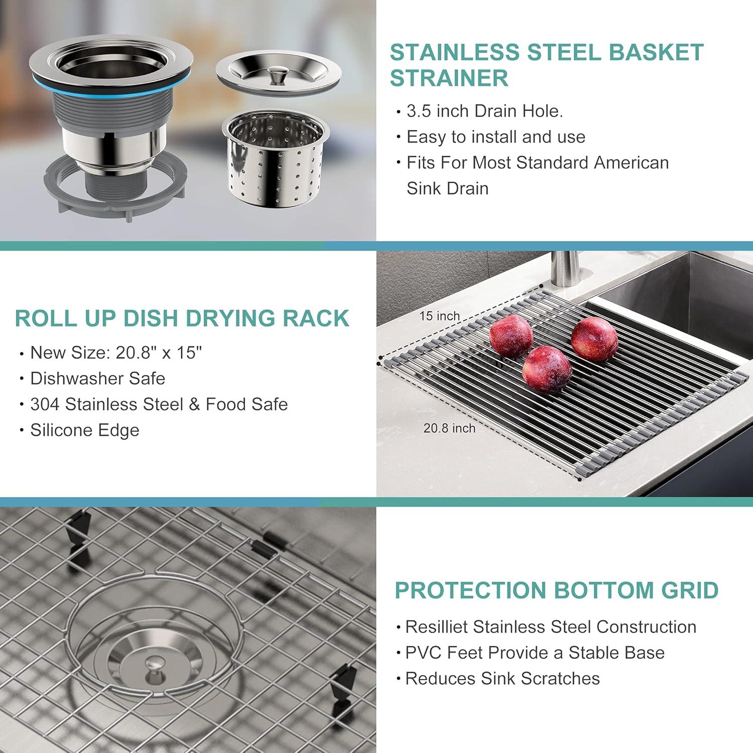 What You Get: Lifetime Limited Warranty, with top-rated customer service that puts you first. Explore the full suite of SINK ACCESSORIES to maximize the functionality of your kitchen sink. 4-Piece Kitchenware includes: ROLL-UP DISH DRYING RACK perfect for rinsing produce, drying dishes, and protecting countertops from hot items; DISH BOTTOM GRID, STRAINER and DRAIN COVER.