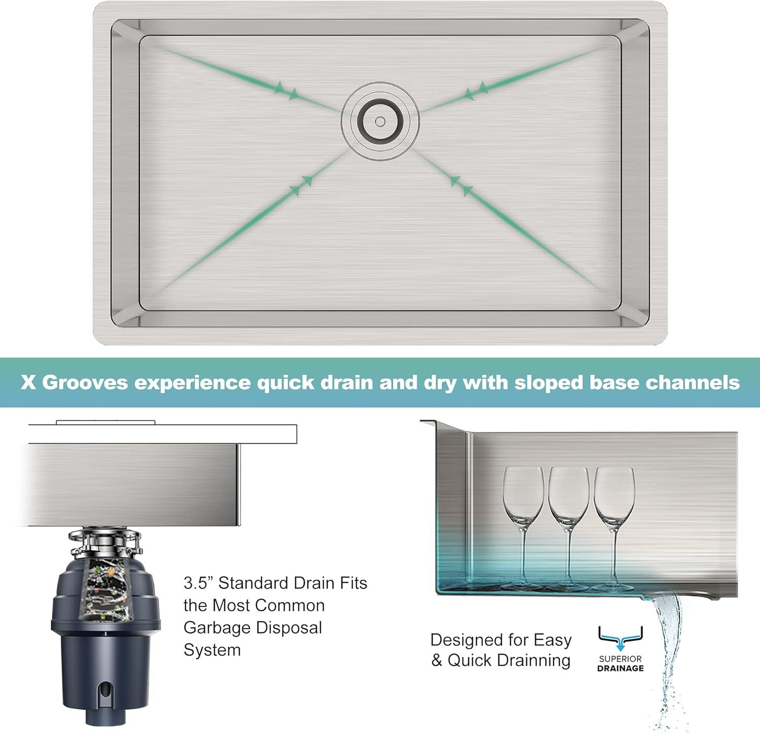Handcrafted By Skilled Artisans: The bottom is slightly tilted to prevent water from standing in the bowl. X grooves design is easy to drain, Rear set 3.5″ drain matches most kitchen appliances and fits the Most Common Garbage Disposal System and unlocks extra space.