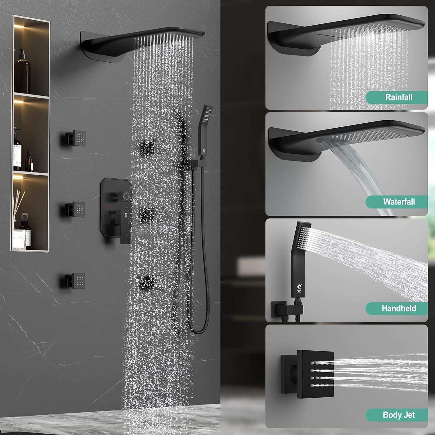 Waist Massage Spray Shower System with 6 Body Jets, 12” Rain Shower System with Jets and Handheld Shower Faucet Set with Rough-in Valve, Wall Mounted Shower Fixture Set for Bathroom, Brushed Nickel(Matte Black)