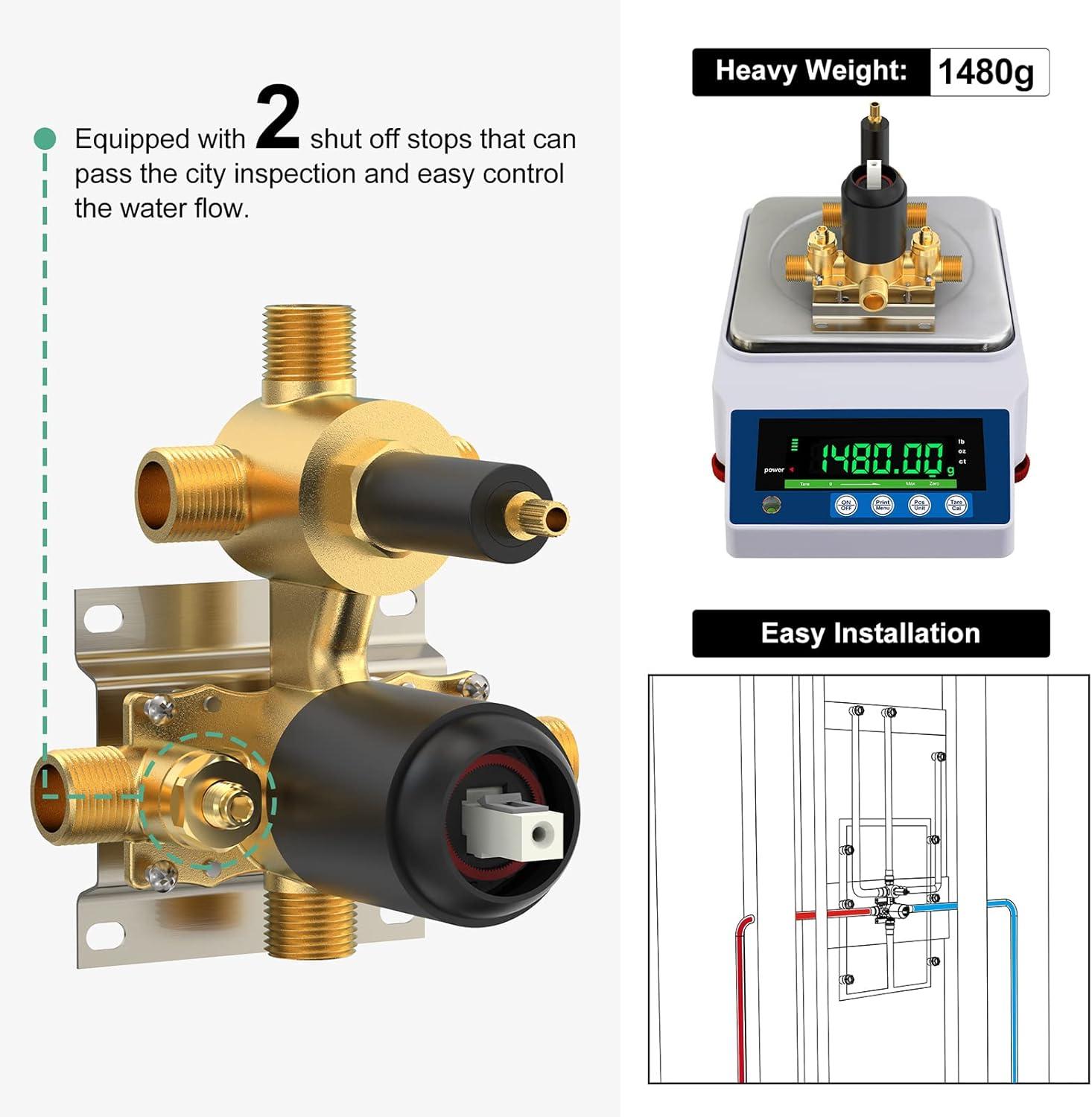 Prevent Water Hammer: This pressure balance valve has built-in Shut Off Stops to effectively prevent water hammer noise and control the water pressure. Pressure balance valve's cartridge monitors water pressure balance, helping to protect you from being scalded by sudden changes in hot or cold water pressure