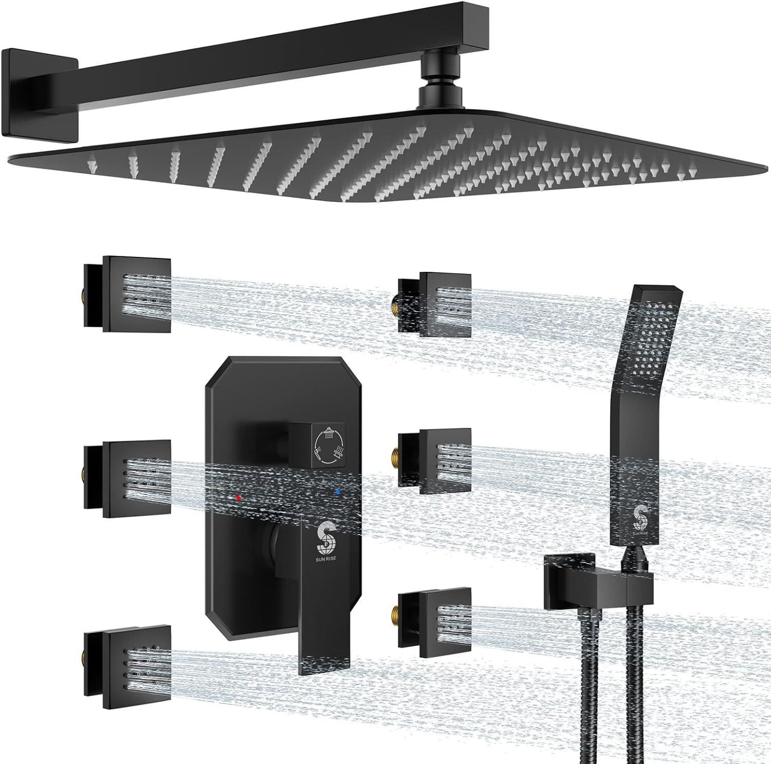 Waist Massage Spray Shower System with 6 Body Jets, 12'' Rain Shower System with Jets and Handheld Shower Faucet Set with Rough-in Valve, Wall Mounted Shower Fixture Set for Bathroom, Brushed Nickel(Matte Black)